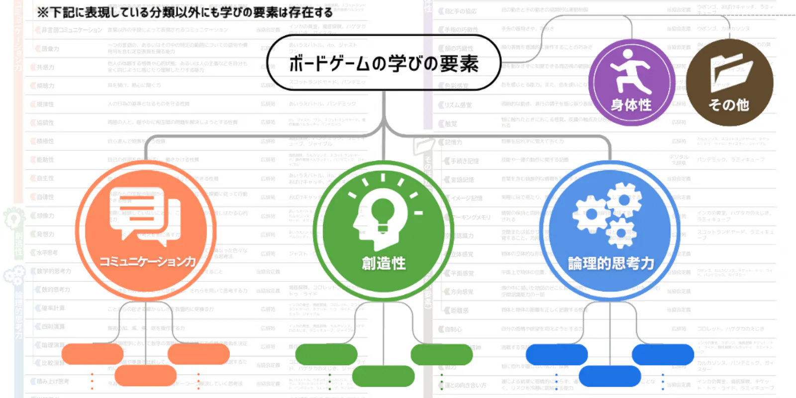 ボードゲーム教育における学びの要素とは、ボードゲームを利用した授業の中で獲得できる能力や技能、マインドセットの総称です。私たちはこの学びの要素を抽出し体系化しました。