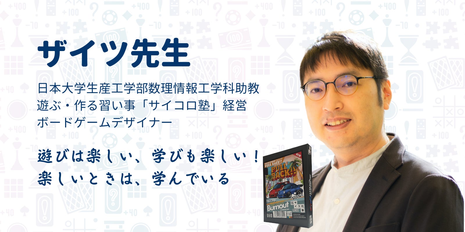 日本大学生産工学部数理情報工学科助教、博士(学術)「ゲームの社会的活用」について研究、博士号を取得。大学講師や、ボードゲーム輸入販売会社の研究開発部門、学童保育の運営などを通じて、「学びをアップデート」するための教育プログラムを開発。現在はボードゲームを「遊ぶ」「作る」習い事・ワークショップを、「サイコロ塾」として開催している。また、「サイコロ塾」のデザイナーとしてゲームデザインも行っている。