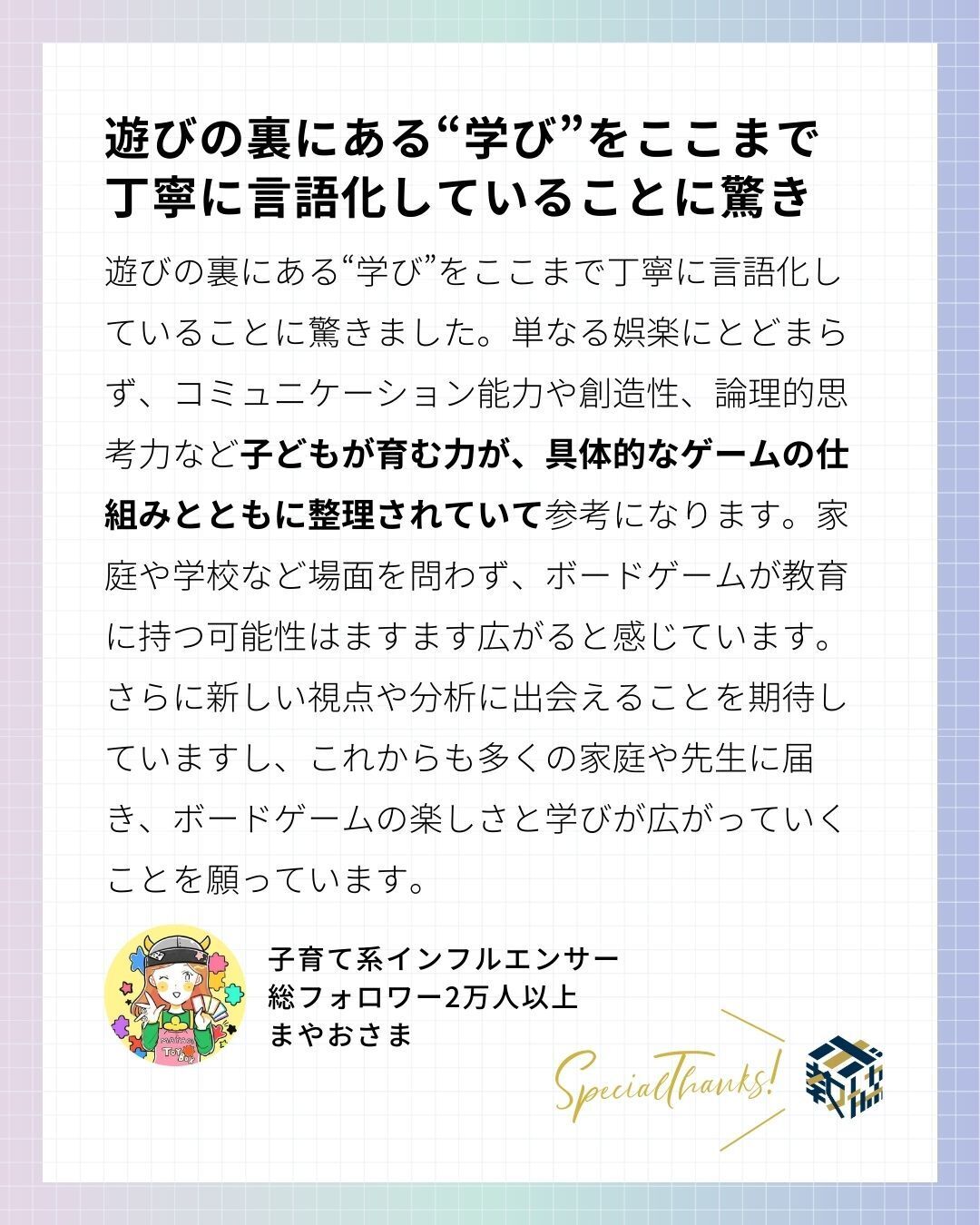 ゲームだからこそ気軽にチャレンジできる。遊びだからこそ失敗も受け入れやすい。アナログだからこそ得られる学びがある。「ボードゲーム」というツールの可能性を感じ取っていただける1冊になりました。ボードゲーム教育をひろげる仲間として、ぜひ一緒に実践していきましょう!