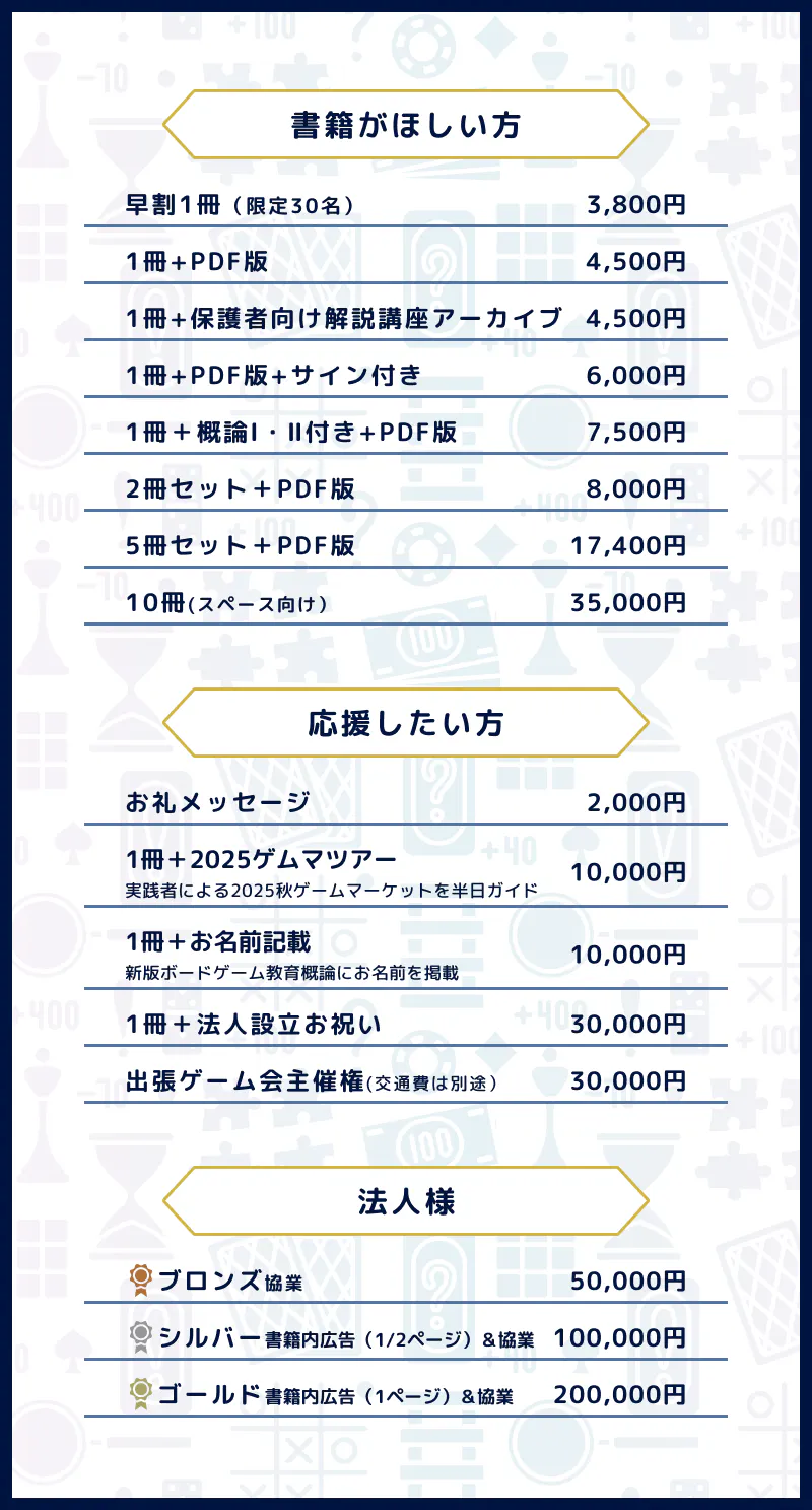 このプロジェクトは、ボードゲームを教育に活かす手法に興味がある、くわしく知りたい方たちに、実践の経験と理論をまとめた『新版 ボードゲーム教育概論』をお届けするためのものです。
