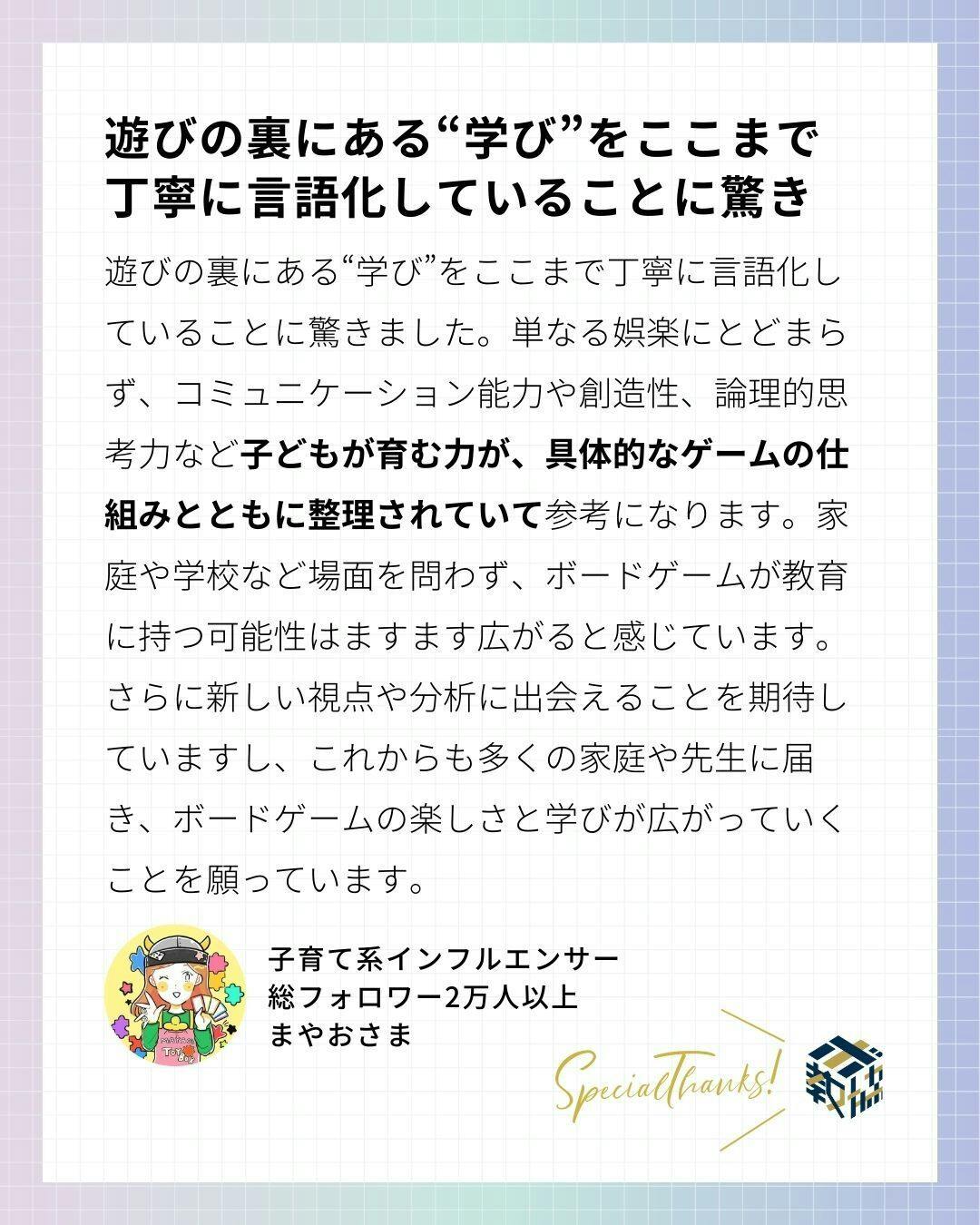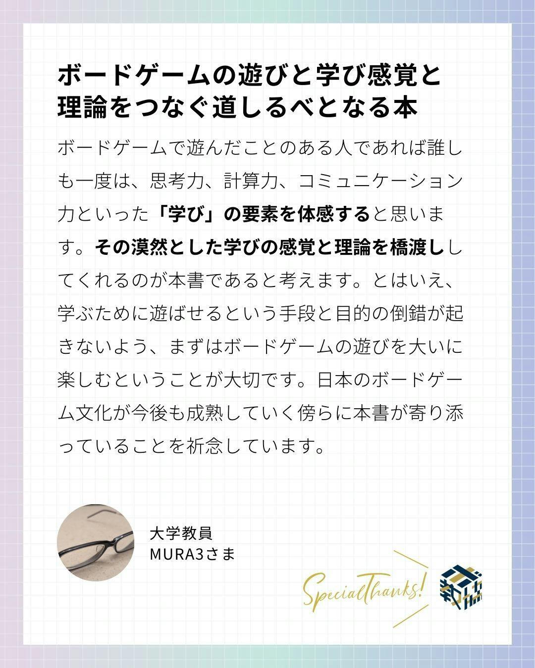 今回、新版 ボードゲーム教育概論の出版に当たり、過去に発刊した「ボードゲーム教育概論」Ⅰ・Ⅱ巻をご活用いただいている教育実践者の方や前作の読者様にレビューとコメントをいただきました。