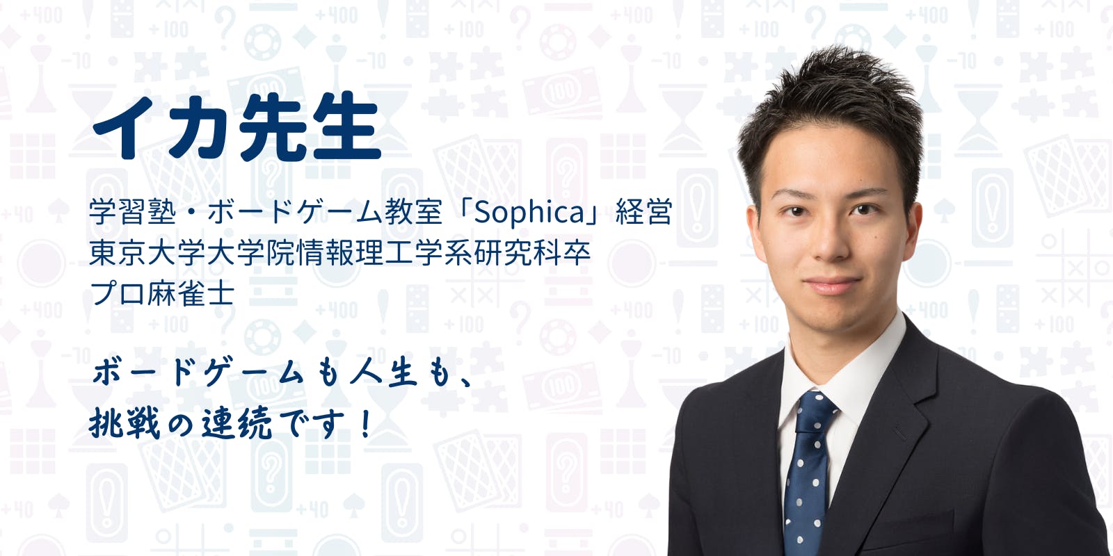東京大学工学部卒・東京大学大学院情報理工学系研究科卒。プロ麻雀士。結婚を機に和歌山県に移住し、2024年麻雀をはじめとしたボードゲーム教室と学習塾「Sophica」をオープンする。学力と人生力の両輪で「好奇心に正直に生きる」をモットーとした指導を行う。