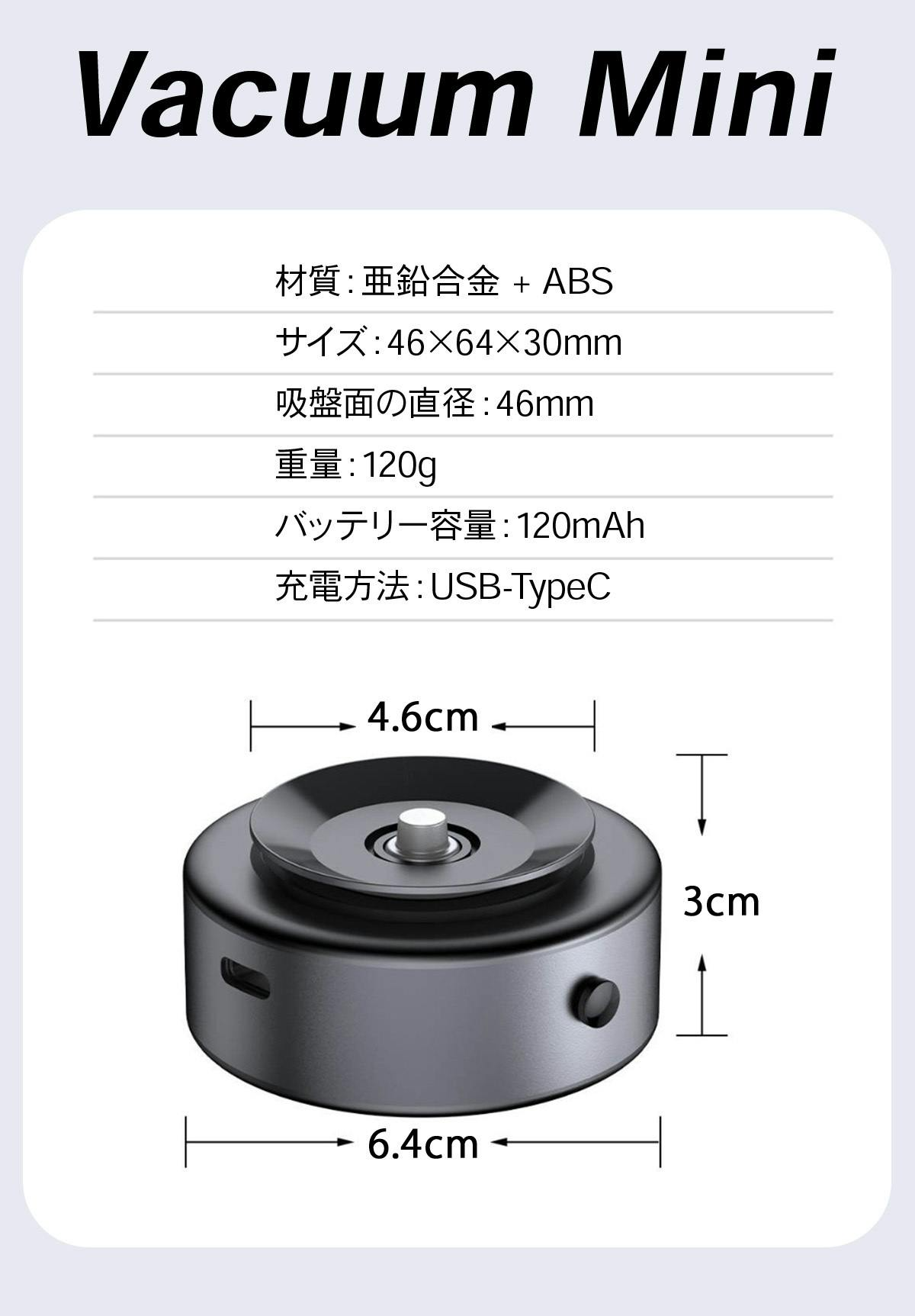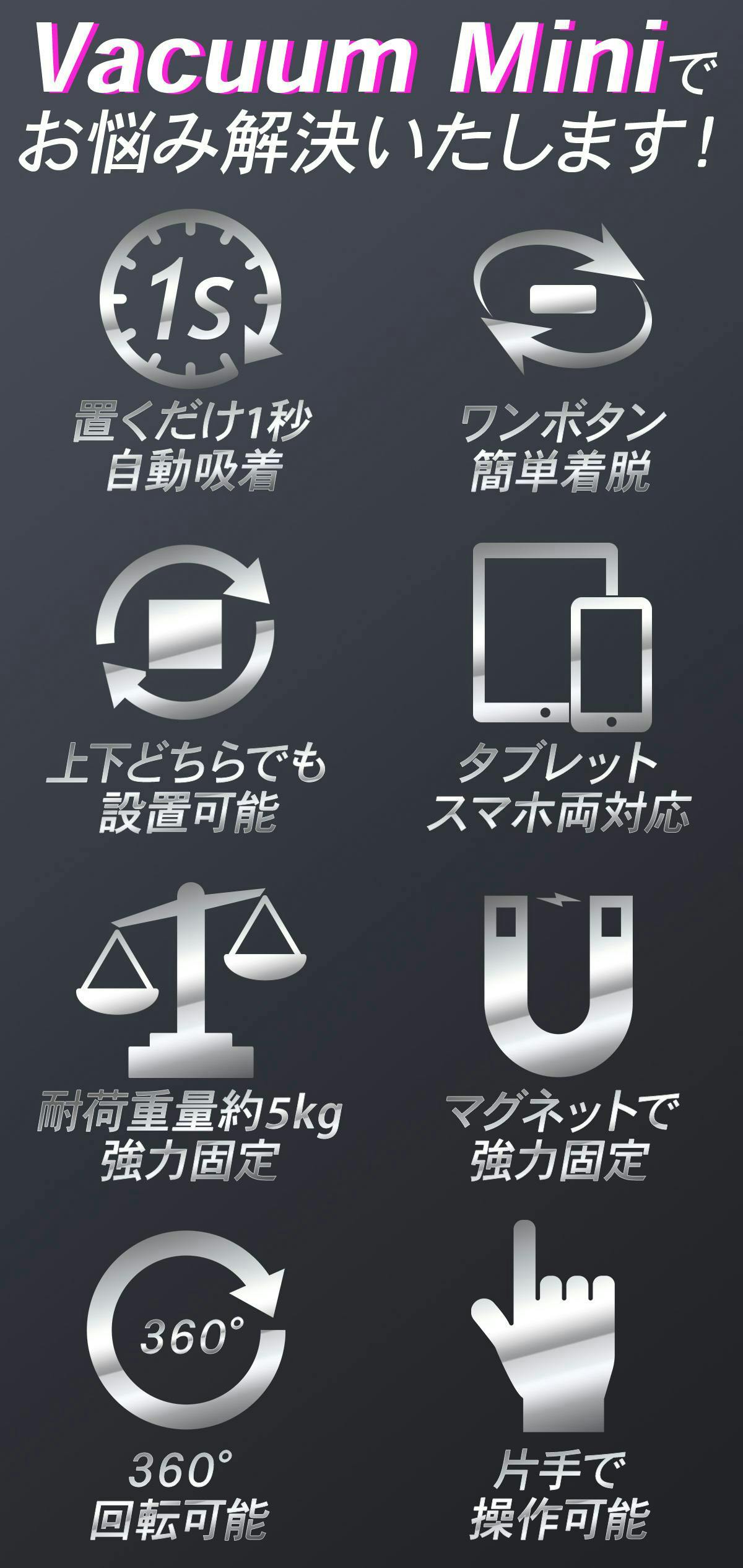 Vacuum Miniは自動吸着システムを採用!平滑面に置くだけで自動検知し、自動で吸引が始まることで接着面が真空になります。