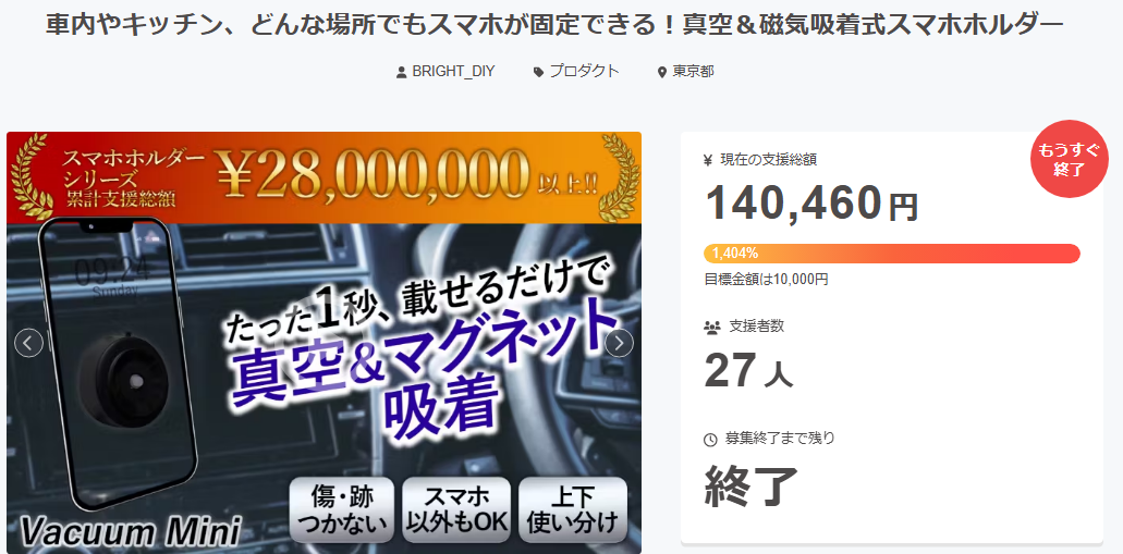 2025/11/01 00:06ご支援者様、車内やキッチン、どんな場所でもスマホが固定できる!真空&磁気吸着式スマホホルダーにご興味をお持ちいただきありがとうございます。プロジェクト開始から44日目で27人ものご支援者の方々より支援頂き、無事プロジェクト終了を迎えることが出来ました。早速皆様のリターンを2025年11月末にお届けできるよう準備を始めております!皆様にご満足いただけるリターンをお届けできるよう、全力で取り組んで参りますので引き続き、「車内やキッチン、どんな場所でもスマホが固定できる!真空&磁気吸着式スマホホルダー」をよろしくお願い致します。BRIGHTチーム もっと見る