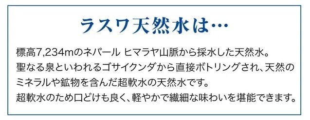 標高8,000m級の水源から直送!ネパール政府公認の超軟水「ラスワ天然水」!