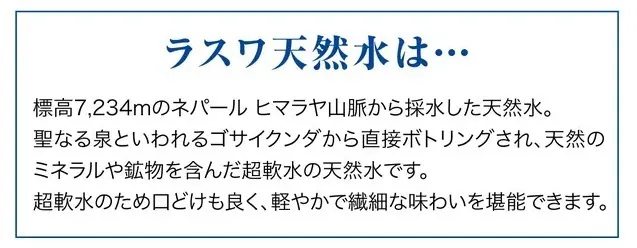 ヒマラヤの雄大な自然が何千年もの時をかけて育んだ、奇跡の水「ラスワ天然水」。