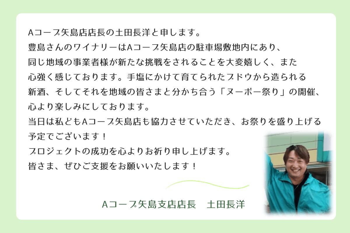 ヌーボー祭りの初開催にあたり不安も多く、皆様からのご支援・ご協力を賜れますと大変ありがたく存じます。皆さまと一緒に、地元を盛り上げて参りたいと思いますので、どうぞよろしくお願いいたします!