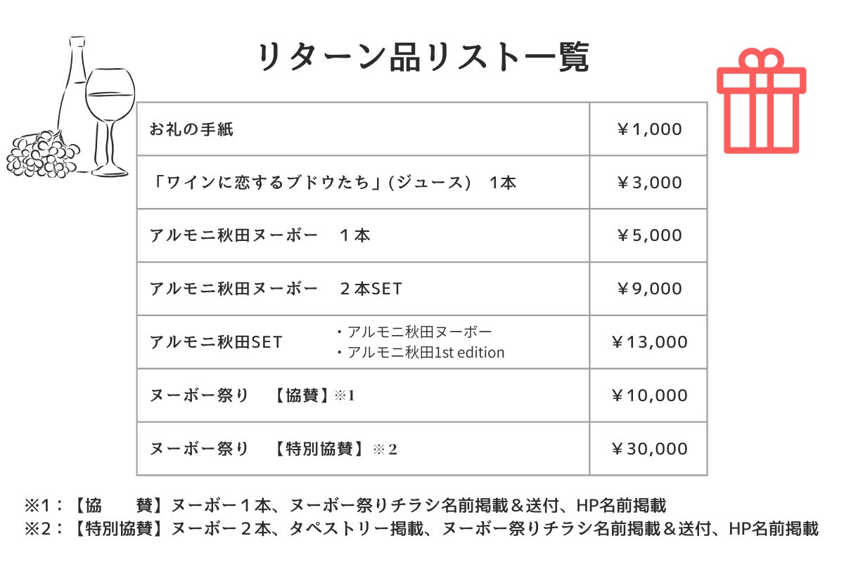 前回のご支援により開業したワイナリーで醸造した「アルモニ秋田ヌーボー」をいち早くお届けしたく、リターンをご用意させていただきました。ふるさと矢島で作ったワインを地元の皆さまをはじめ、たくさんの方に楽しんでいただければと思います。また、11月のヌーボー解禁日に合わせて行う「ヌーボー祭り」開催のご支援もお待ちしております。