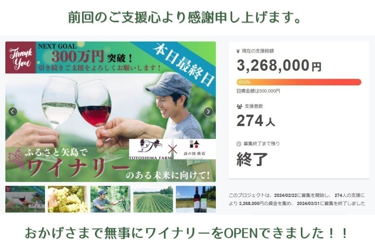 前回(2024年2月)のクラウドファンディングでは皆様からの温かいご支援のおかげで、無事に念願のワイナリーを完成させることが出来ました。この場を借りて、改めて心より感謝申し上げます。