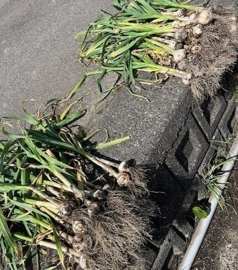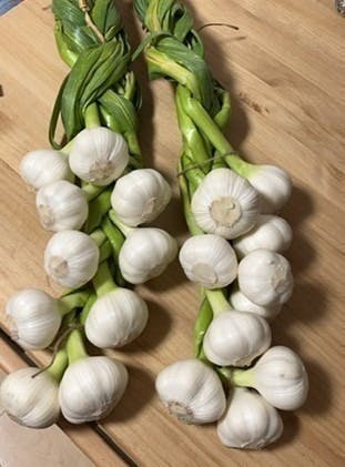 ニンニクは山梨産、10個ごと縛って纏めます。軒下風通しの良い日の当たらない場所で吊るして保管してください。高温多湿での保管は避けるようにお願いします。発送の際は収穫日の記載を行います