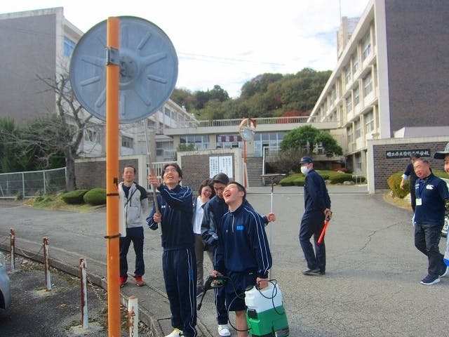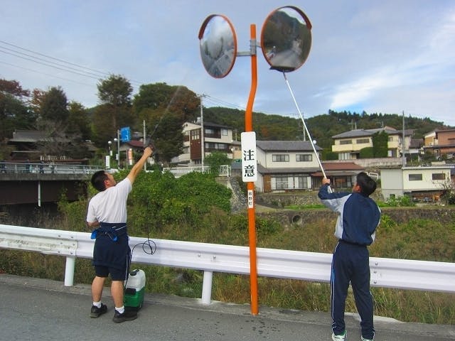 生徒26名の活動に、地域の大人の方々38名、教員も含めて総勢約80名が参加して、皆野高校から皆野駅・親鼻駅、皆野町役場周辺の通学路を中心に清掃することができました。カーブミラー清掃も毎年行っています。