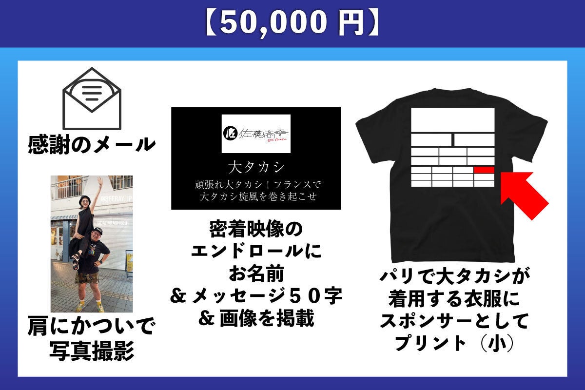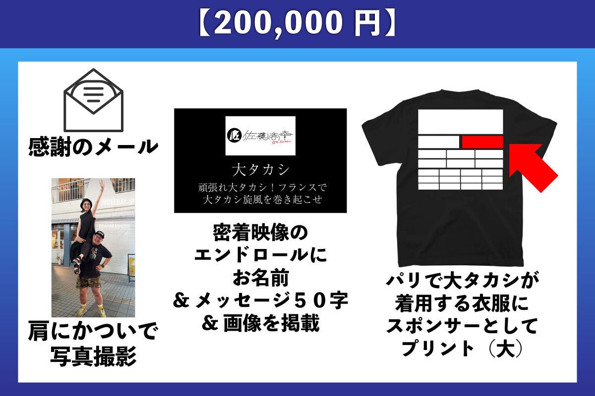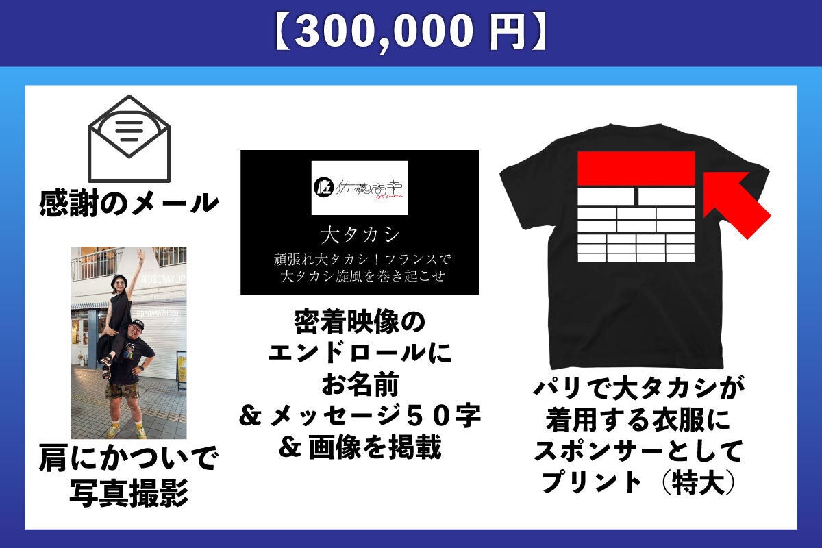 ・パリで大タカシが着用する衣服にスポンサーとして、小サイズでプリントいたします。個人名やお店や企業のロゴでも可能です。