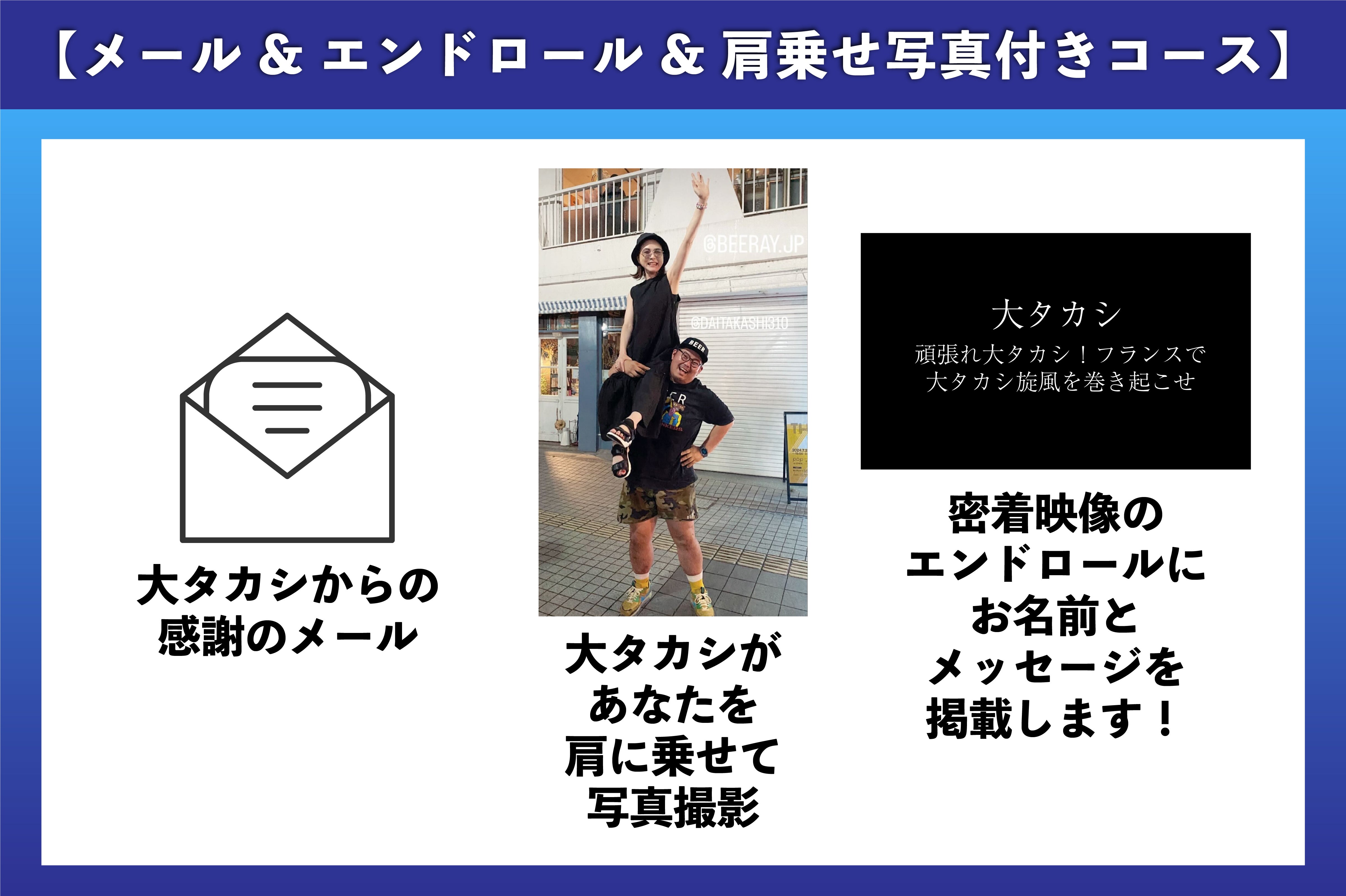 メール、エンドロールにお名前&メッセージ掲載に加えて大タカシがあなたを肩に担いでお写真を撮ります!