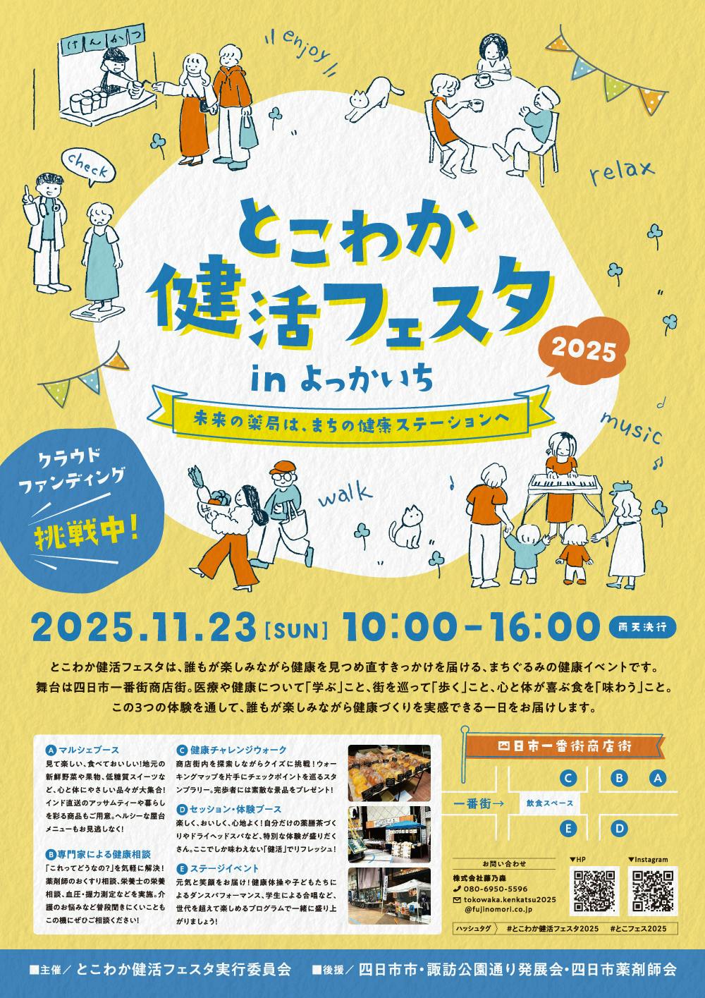 “まちの健康ステーション”なんて、ちょっと想像しづらいかもしれません。だからこそ、まずは“体験”してもらう場をつくります。それが、今回企画している《とこわか健活フェスタ2025 in よっかいち》です。このイベントでは、未来の薬局を“見て・触れて・話して・感じる”ことができます。