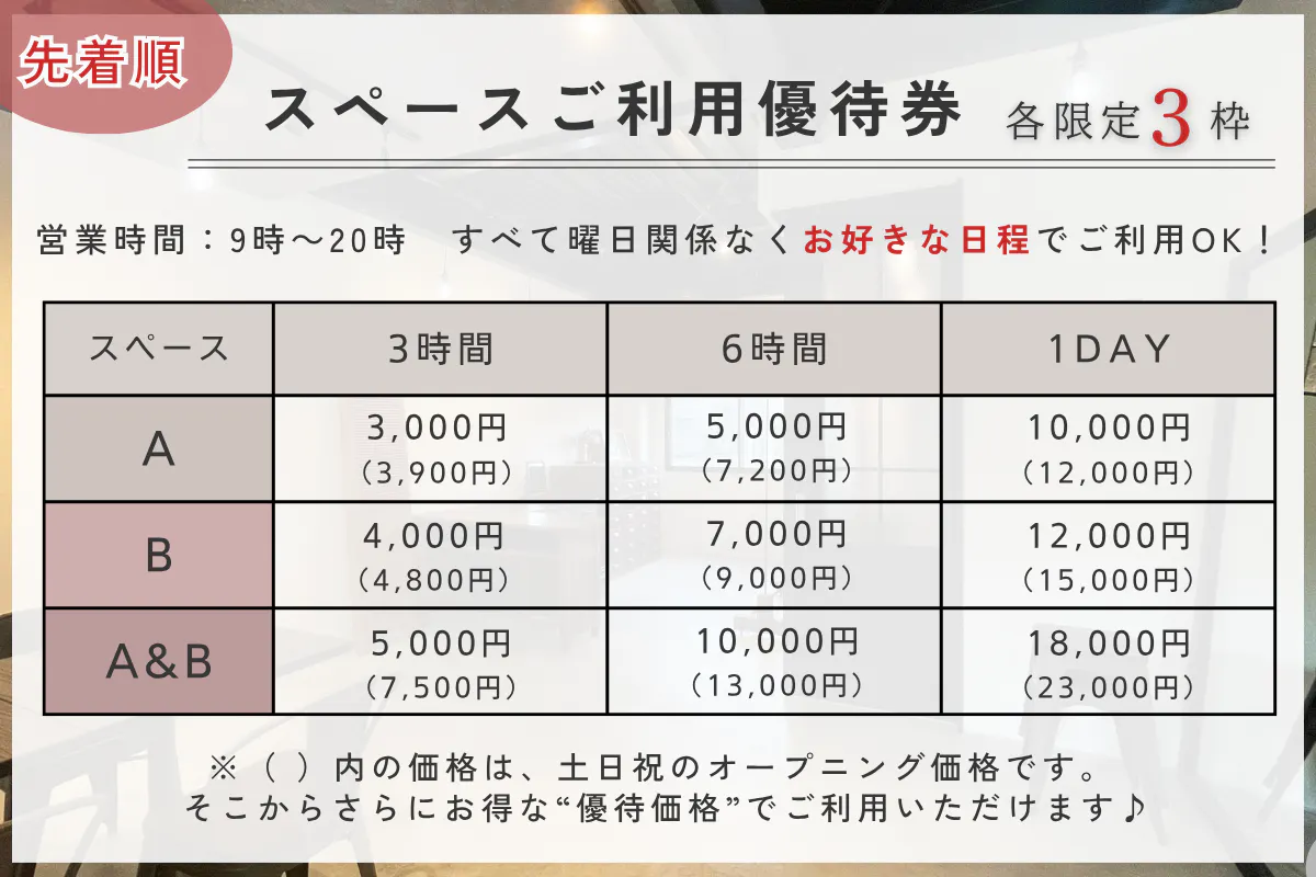 ◆【各限定3枠】スペースご利用優待券