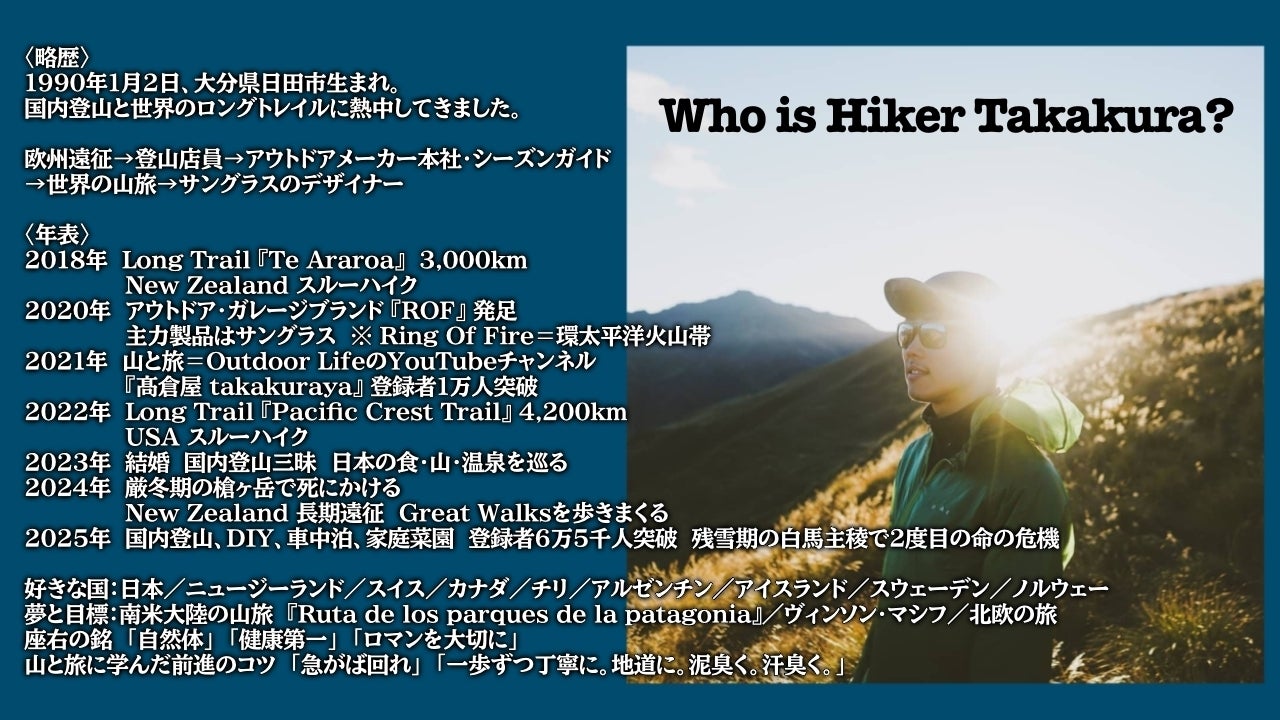 普段は「山と旅 Outdoor×LifeをテーマとしたYouTubeチャンネル『髙倉屋 takakuraya』の運営を主として、様々な形で経験を活かした発信と表現を継続しています。