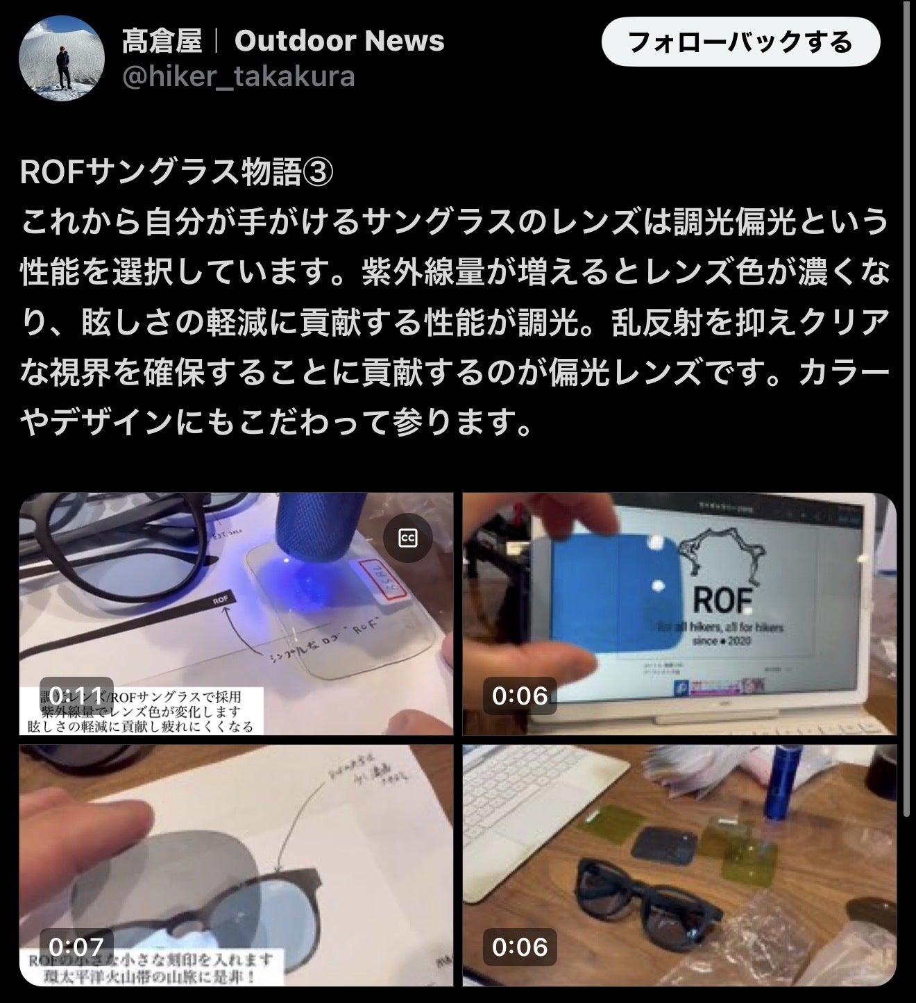 2026/04/01 16:03ROF Sunglasses Project運営の髙倉屋です。本プロジェクトを見守り、背中を押してくださった皆さまへ。この度、2026春の先行受注会が昨晩をもちまして、無事に終了いたしました。おかげさまで目標金額を達成し、一つの大きな形を成すことができました。皆さまから寄せられた温かいご支援と、託していただいた想いに、心より感謝申し上げます。達成率:173%支援者様数:94名振り返れば、今回もゼロベース、構想とイメージから始まった挑戦でした。それでも、こうして結果を残すことができたのは、派手な宣伝ではなく、皆さま一人ひとりが価値を見出し、力強く応援してくださったおかげです。今回のプロジェクトを通じて「仲間」になってくださった皆さま!同じ景色を目指すパートナーとして、これからも末永くよろしくお願いいたします。お時間許しましたら、こちらのコラムもぜひご覧ください。モノづくりに関する想いも記載しています。https://note.com/rof_jp/n/n69f46a36e04d「道具」のその先へROF Sunglasses Projectは、単なる「製品のリリース」で終わるものではありません。製品は、私たちが提案する「ROF」の思想を届けるための、また髙倉屋の考え方を共有するための乗り物であるような意識で届けています。『髙倉屋新聞』もお楽しみに…!手にした道具が、皆さまの歩む道をより鮮明に、より豊かに、より健やかに彩る一助となること。そして、その道具と共に過ごす時間が、人生の確かな充足感に繋がっていくこと。最高のアウトドアライフを支える一本になること。私たちは今後も、流行に左右されない「本物」を追求し、皆さまの手元へ届けていく活動を継続してまいります。今後の活動と繋がりについて今後はリターンの製造を進行し、発送準備を丁寧に進めるとともに、次なる歩みについても少しずつ形にしていく予定です。日々の試行錯誤や、道具に込めた細かな哲学については、以下のSNSにて発信しております。お時間が許す際に、そちらも覗いていただければ幸いです。• Instagram:hiker_takakura山での実践や、道具と向き合う日々を綴っていますhttps://www.instagram.com/hiker_takakura•X(旧Twitter):ROF_JPブランドの理念や、開発の裏側、最新情報をお届けしますhttps://x.com/ROF_JPクラウドファンディングという一つの山を越えましたが、ここがまた新たなスタートラインです。浮き足立つことなく、冷静に、かつ情熱を持って次なる山へと向かいます。サングラスを落としにくくできる構造付きの、宇宙先端技術を駆使したTシャツも好評受け付け中です。※こちらはコラボアイテムで、コラボ先の意向もありMakuakeにて受付中。https://www.makuake.com/project/rof-moon-hiker-t/引き続き、見守っていただければ幸いです。ROF髙倉屋 もっと見る