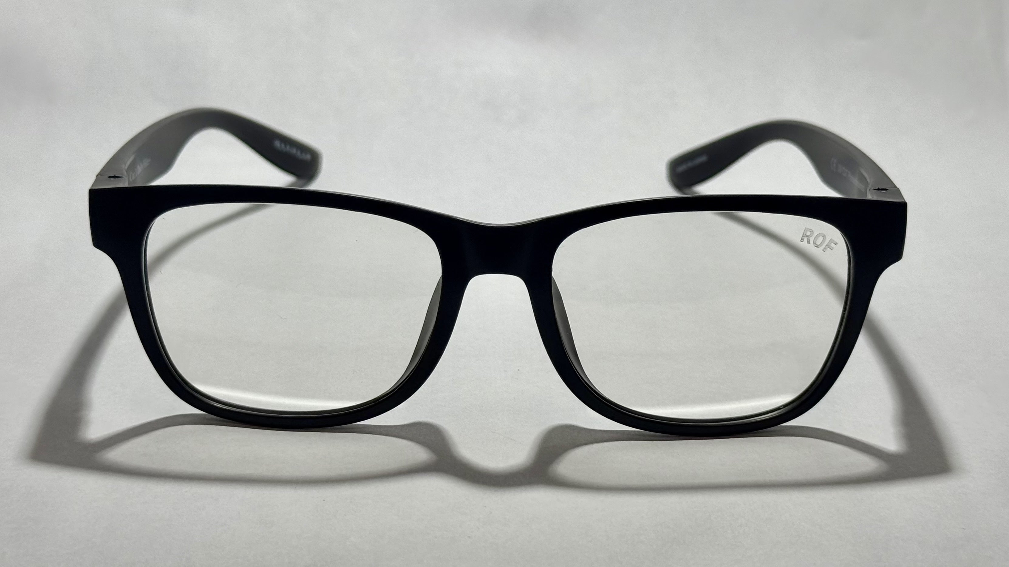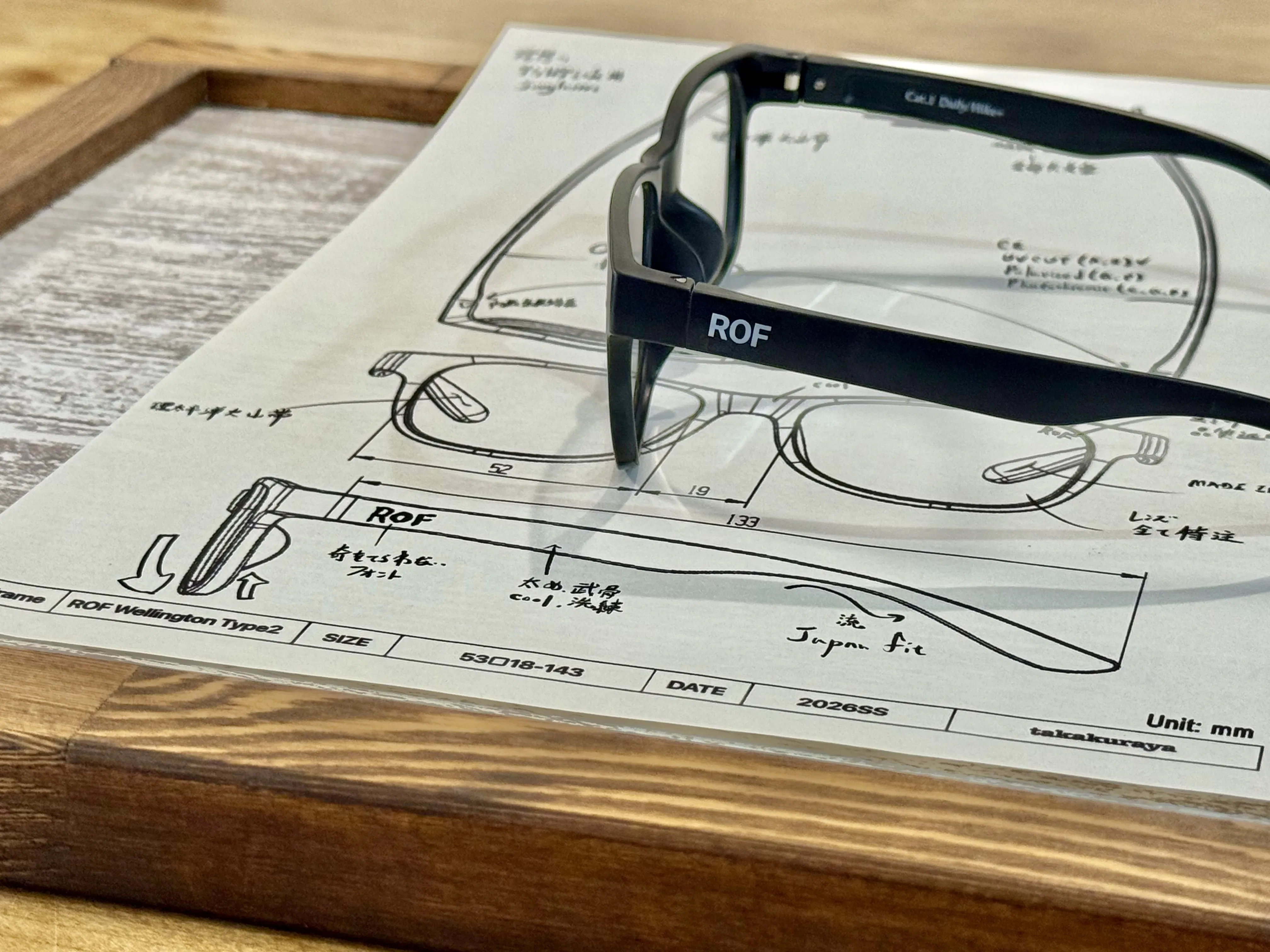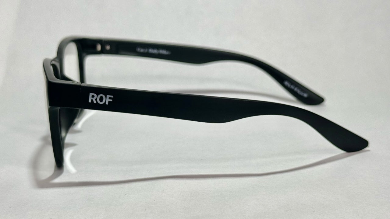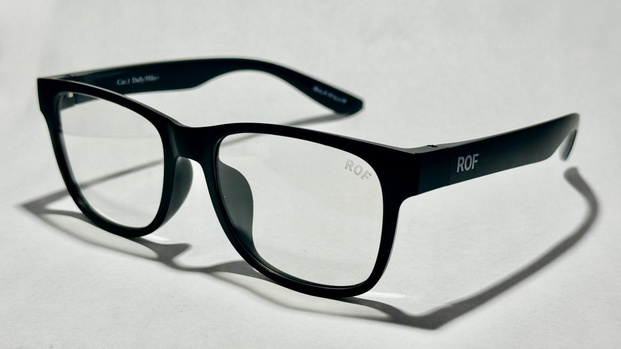 特注クリアレンズ。透明でもしっかりUVカットします。レンズに刻印されたROF刻印は品質の証。