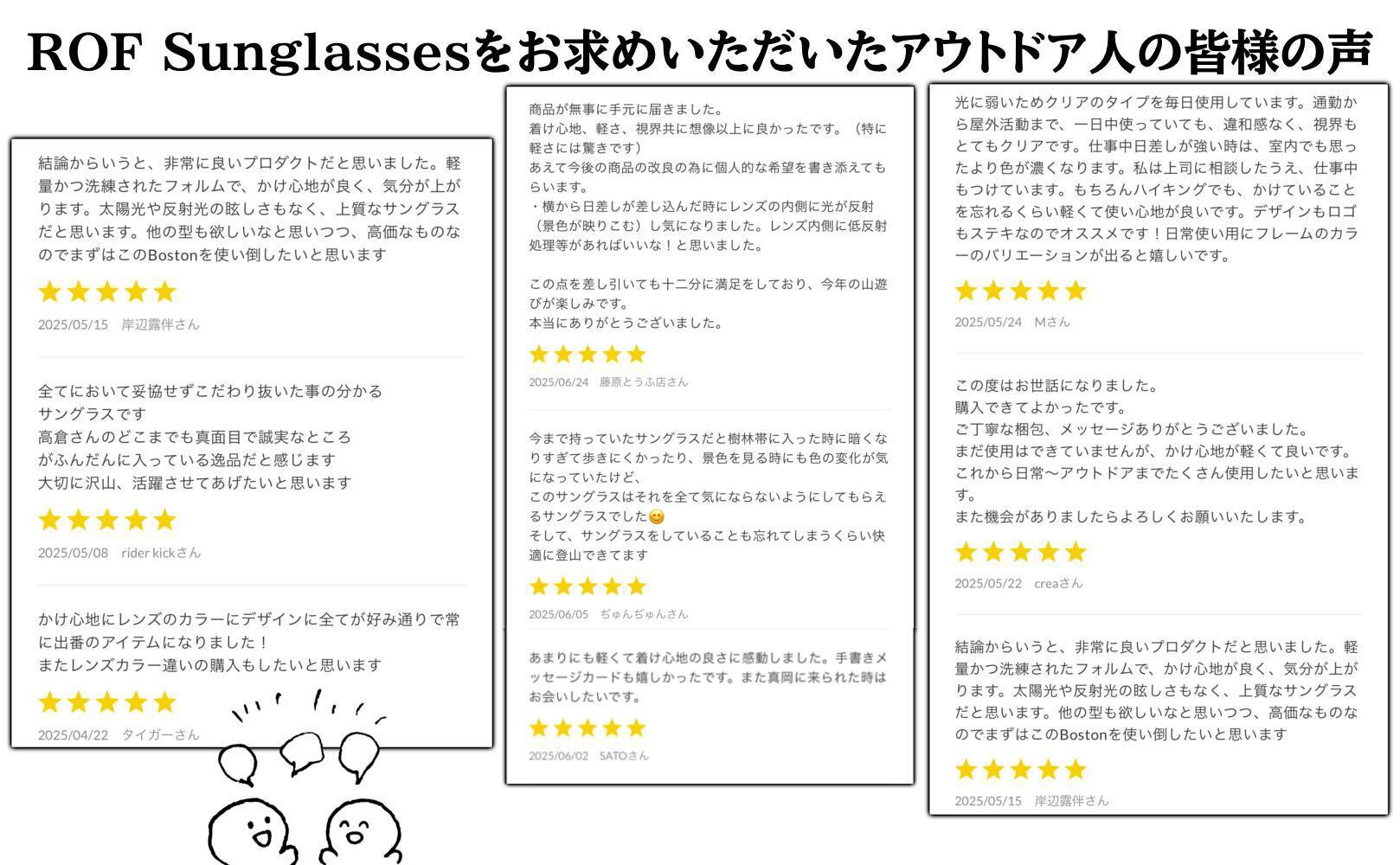 ROFは、高品質のサングラスを開発し提供しています。アウトドアを愛する方向けにポイントを押さえながら再構築した上で、同等他ブランド品より約5千〜1万円ほど安く提供することに取り組んでいます。これは「安かろう悪かろう」ではありません。「余計なコストを削ぎ落とした」結果です。