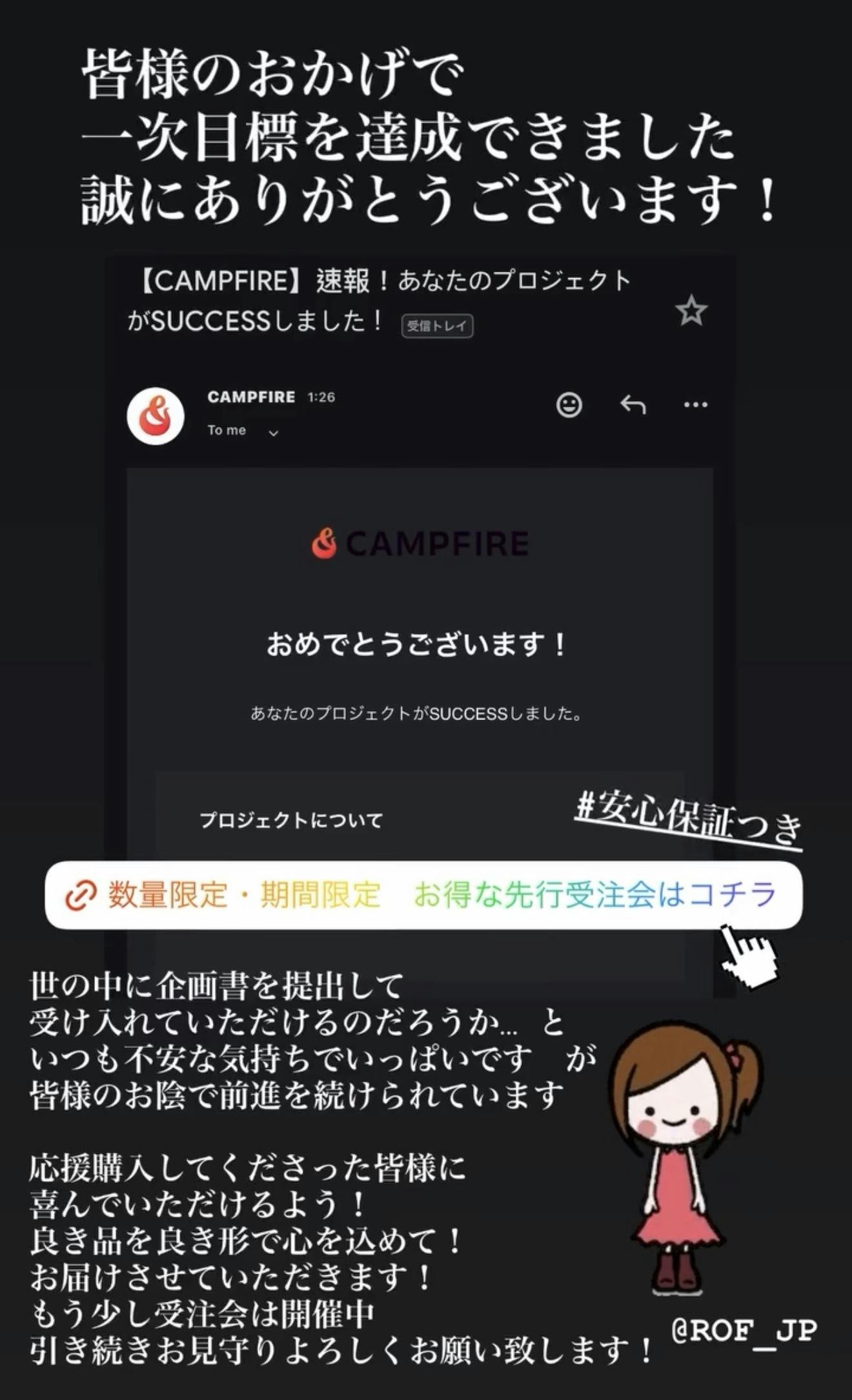 2026/03/13 13:30こんにちは!ROF Sunglasses Project 運営の髙倉屋です。プロジェクト開始から、皆様の温かいご支援と力強い応援のおかげで、第一次目標金額を達成することができました! 誠にありがとうございます。不安を勇気に変えてくれたのは、皆様でした毎回、新しい企画を世に問う際は「果たして本当に受け入れていただけるだろうか…」という不安で胸がいっぱいになります。しかし、開始直後からの皆様の圧倒的なレスポンスを拝見し、ROFが目指す「本質的な価値」と「ユーザーとの信頼関係の構築」ができてきており、伝えたいことがしっかりと伝わっているのだと確信することができました。皆様のお力添えがあってこそ、私たちは前進し続けることができます。いただいたご支援は、ROFサングラスの型代や量産費用、そして今後の流通・次なる製品開発を円滑に進めるための大切な原動力として、責任を持って活用させていただきます。みんなで一緒にプロジェクトを育てているという感覚を持っていただけると、とても嬉しく思います!次なる挑戦「ネクストゴール 110万円」へ一次目標達成後も、引き続き多くの方にご注目いただいていることを受け、私たちは「ネクストゴール:110万円」を設定いたしました。実は、企画書下部にある通り資金はこの5倍くらい必要ですます。ROF Sunglasses Projectは、シリーズ企画となっています。この挑戦をさらに大きなものにし、より多くの方にROFのクオリティをお届けするための物語すべてを、皆様にお楽しみいただけますと嬉しく思います。募集期間はまだございますので、引き続きこのプロジェクトの行く末を温かく見守っていただければ幸いです。プレゼント包装についてDMでお問い合わせいただくことが数件ございましたので、お答えさせていただきます。例えば、彼氏さん、旦那さん、大切な人の目肌の健康を祈って「ROF Sunglassesをプレゼントしたい!」と言う場合は、応援購入の際にメッセージを添えてくださいませ。簡易的ではございますが、髙倉屋よりギフト梱包しまして、そのままプレゼントして喜んでいただけるようにお包み致します。「良き品を、良き形で」お届けするために前回の発送一次目標は達成いたしましたが、私たちの本当の取り組みはまだ始まったばかりです。ご支援いただいた皆様に「手にして良かった」と心から喜んでいただけるよう、細部まで心を込めて、最良の形でお手元に届けるべく尽力してまいります。「髙倉屋がこんな企画やってるよ!」「ROF Sunglassesの新型が今お得だって!」こんな感じで、山友達、アウトドア仲間、キャンプ界隈の皆様にシェアしていただけますと大変嬉しく思います。https://camp-fire.jp/projects/876688引き続き、熱い応援を、どうぞよろしくお願い申し上げます!ROF Sunglasses Project 運営一同髙倉屋 もっと見る