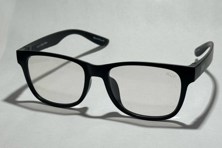 特注クリアレンズ。透明でもしっかりUVカットします。レンズに刻印されたROF刻印は品質の証。