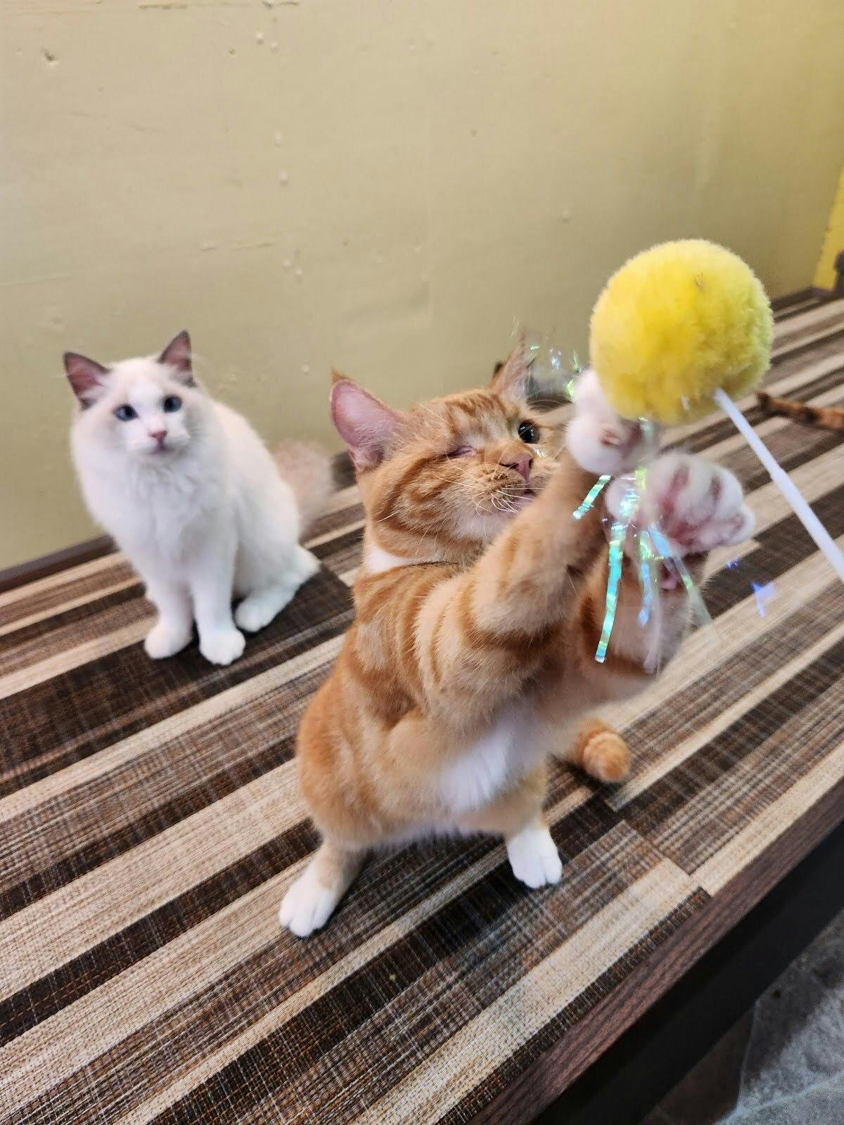 人慣れしている猫スタッフが多い当店の中でも特に温和な性格ですので、猫との関わりが初めての方にも安心して触れ合っていただけます。