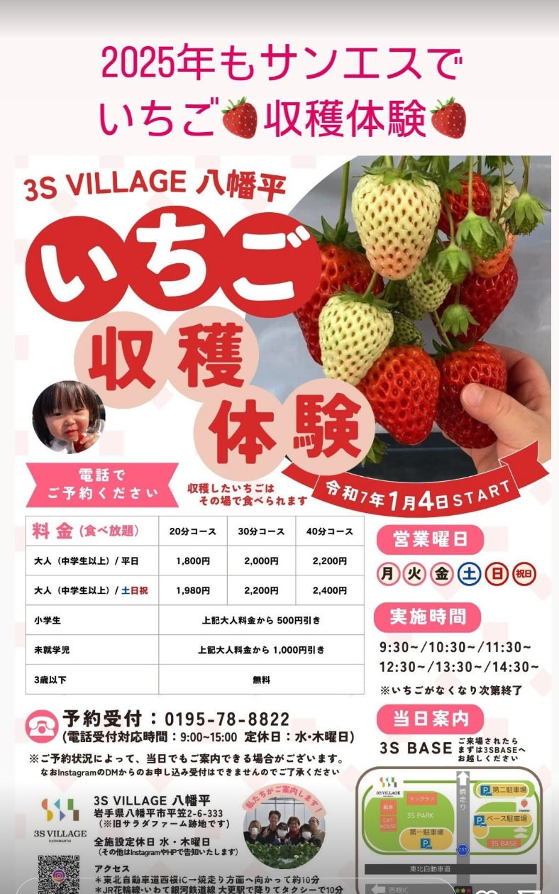 12月下旬からは、寒暖差で甘く育ったいちごのいちご狩りも始まります。岩手県にお出かけの際には、ぜひ「3S VILLAGE」にお立ち寄りください。