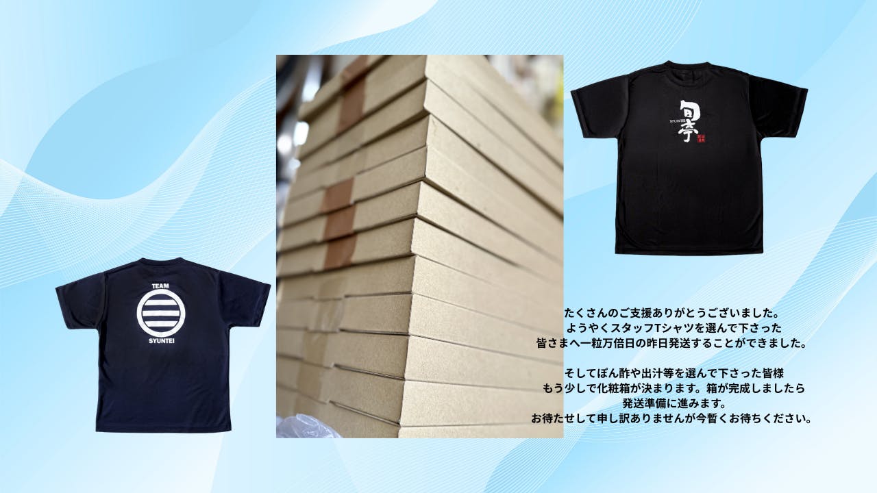 2026/02/14 17:36たくさんのご支援ありがとうございました。ようやくスタッフTシャツを選んで下さった皆さま全員に一粒万倍日の昨日発送を終えることができました。お待たせして申し訳ありませんでした。そしてぽん酢や出汁等を選んで下さった皆様へあともう少しで化粧箱が決まります。箱が完成しましたら発送準備に進みます。 随分お待たせして心苦しく申し訳ありませんがどうか今暫く楽しみにお待ちください。よろしくお願いいたします。 もっと見る