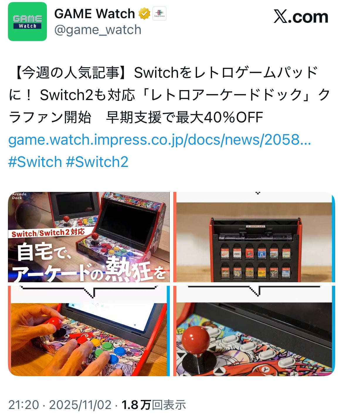 このたび、本プロジェクト 「レトロアーケードドック」 が大手ゲームメディア GAME Watch(@game_watch) のX(旧Twitter)で紹介されました!