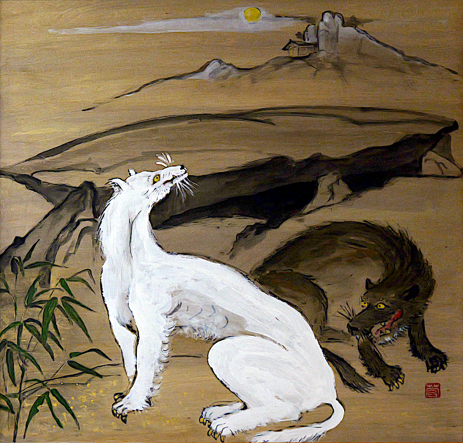 家臣がその跡を追うと、岩穴に潜む墨虎を発見。