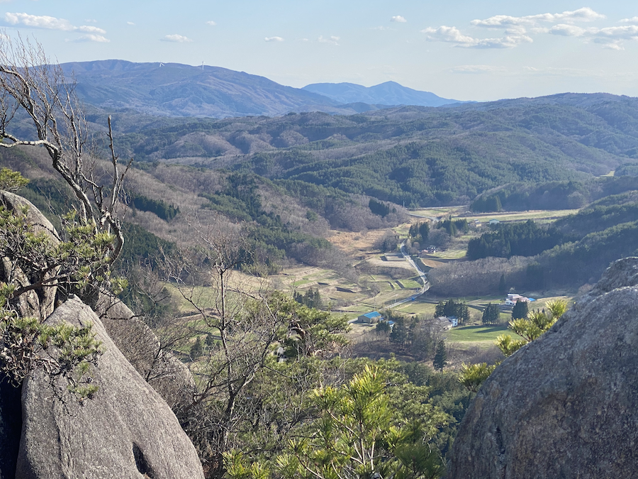 神社の背後にそびえる虎捕山には、いくつもの巨岩が連なります。拝殿から山道を辿り、約650メートル登ると奥宮本殿へ。山頂からは村の風景が一望でき、いまも人々の祈りと自然の大きな循環が感じられる場所です。