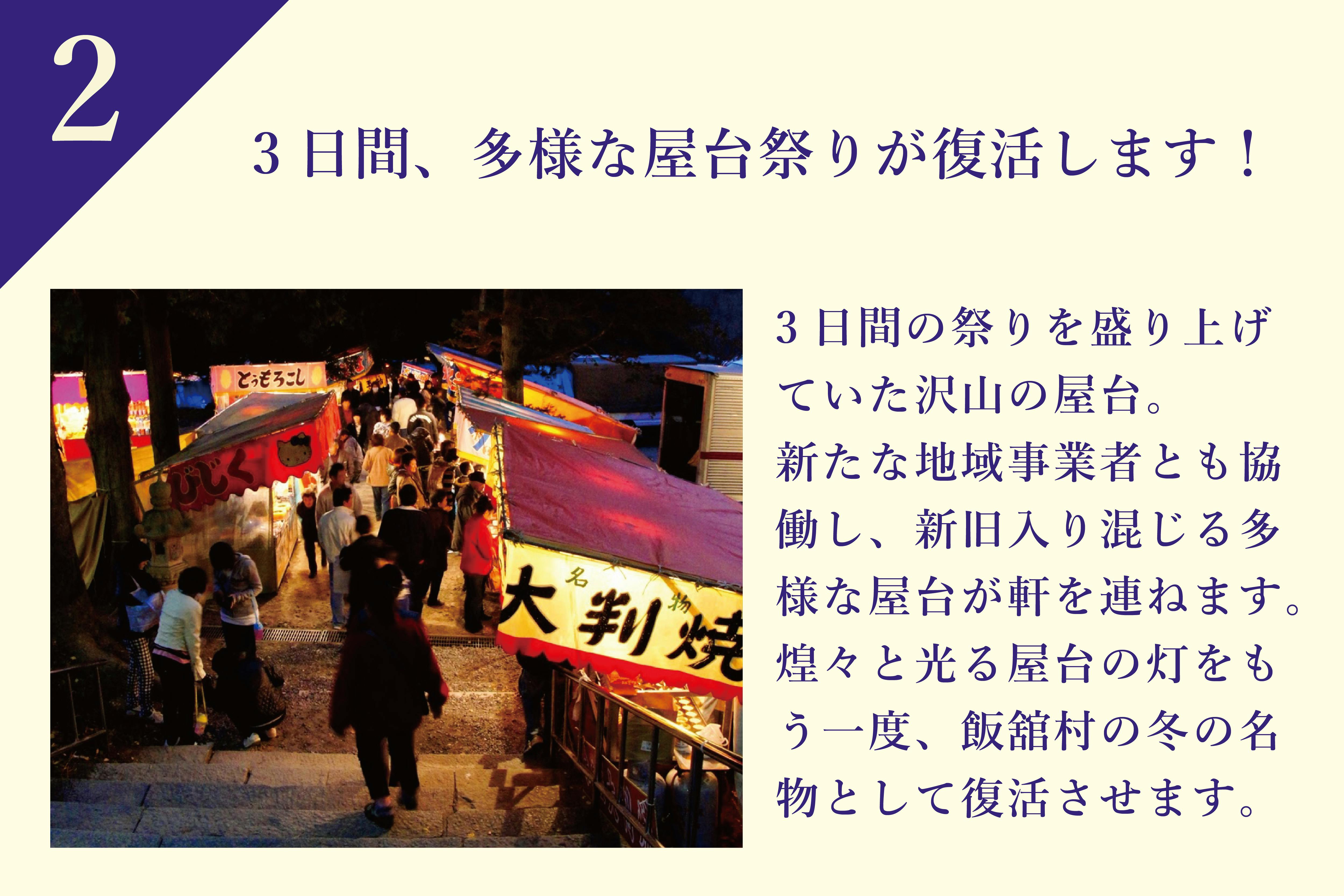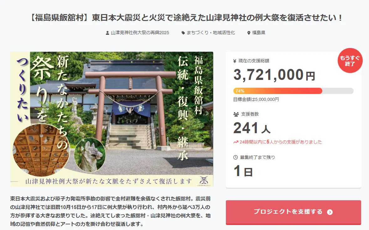 2025/12/03 21:07クラウドファンディング終了から3日が経ちました。お礼が遅くなってしまい、申し訳ございません。改めまして、この度は山津見神社例大祭の復活に向けたクラウドファンディングをご支援、応援いただきまして誠にありがとうございました。最終的に、267人の方々に総額4,286,000円のご支援いただきました。これほどの応援をいただき、本当に感謝してもしきれません。本当にありがとうございます。上記の金額よりクラウドファンディングの手数料を差し引いた金額を、例大祭の運営・準備費用とリターンの準備費用として活用させていただきます。リターンについては例大祭が終わり次第、順次発送準備を進めます。到着が予定より遅れる場合、事前にメールにてご連絡いたしますので、ご確認のほどよろしくお願いいたします。それでは明日より始まる例大祭に向けて、例大祭前、最後の報告となります。飲食について今回、山津見神社のある佐須地区の皆さんが運営する茅葺屋根の屋台だけでなく、震災前にあったお祭りの屋台の風景も復活します。下記、出店者さんのご紹介になります。佐須地区のお母さんたちが作る郷土料理。こちらではうどんなどお母さんお手製の料理が食べられます。地域のガヤガヤ感も含めぜひお楽しみください。参道脇にお祭りならではの屋台が立ち並びます。また地域の店舗等から出店いただけることになりました。店舗等から出店いただく皆様については、詳細を例大祭公式のInstagramにてお知らせしております。ぜひ、そちらをご確認ください!https://www.instagram.com/reitaisai_yamatumi_iitate/例大祭スケジュール改めまして、スケジュールですが、ご祈祷は朝8時から、茶屋・屋台は9:00からとなっております。各日終了時間が違いますので、時間確認の上お越しください。終了時間については目安となっており、お客様の来場者数によって多少前後する場合がございます。あらかじめご了承ください。また、明日より一気に冷え込み氷点下近い気温になることが予想されております。防寒対策はなるべくしておりますが、野外であることも含め、十分に暖かい格好でお越しください。それでは、例大祭で皆様にお会いできることを楽しみにしております! もっと見る