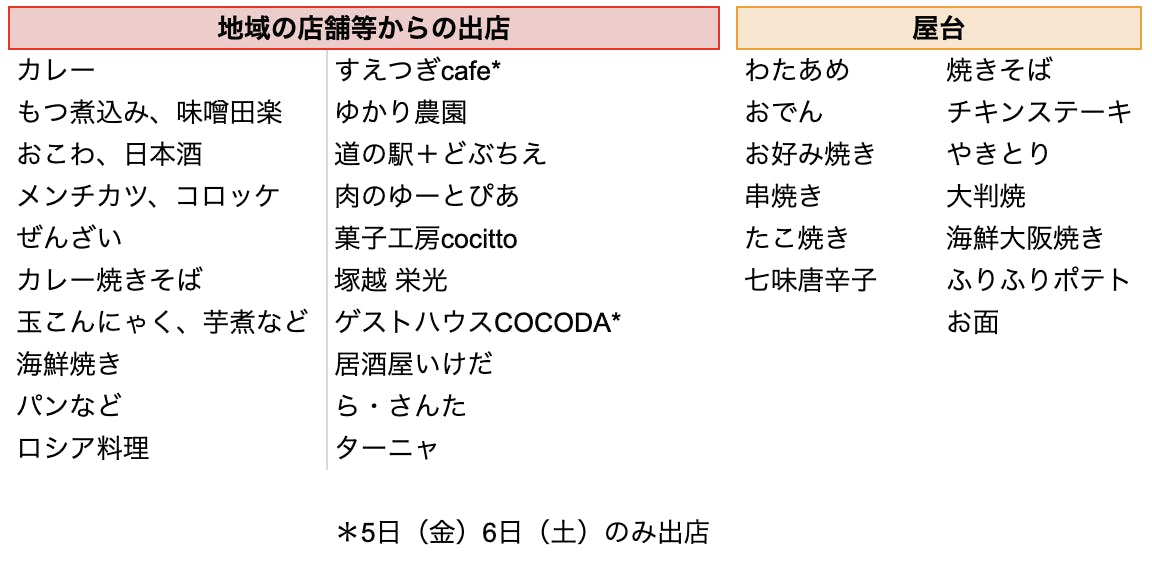 今回、山津見神社のある佐須地区の皆さんが運営する茅葺屋根の屋台だけでなく、震災前にあったお祭りの屋台の風景も復活します。下記、出店者さんのご紹介になります。