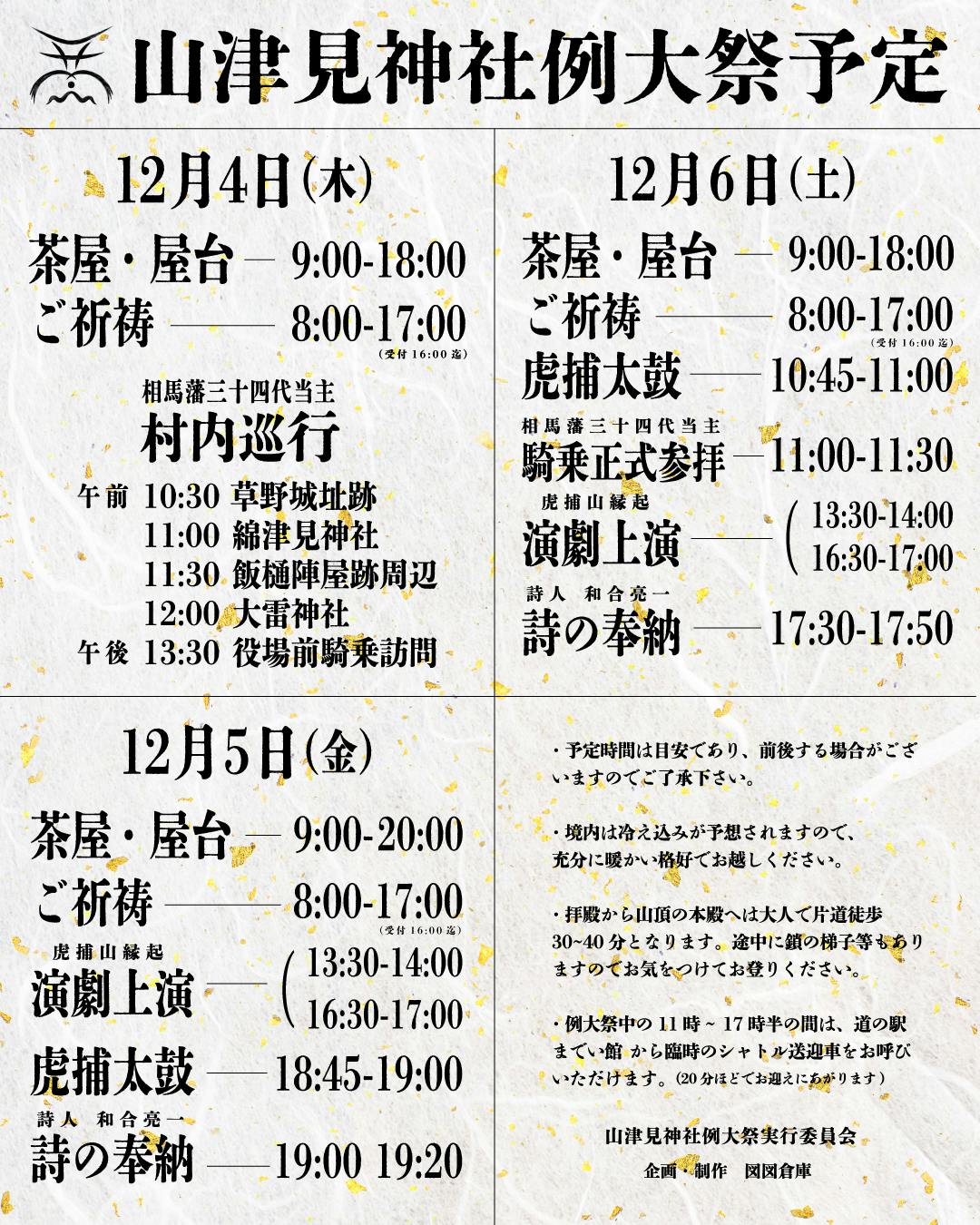 改めまして、スケジュールですが、ご祈祷は朝8時から、茶屋・屋台は9:00からとなっております。各日終了時間が違いますので、時間確認の上お越しください。終了時間については目安となっており、お客様の来場者数によって多少前後する場合がございます。あらかじめご了承ください。