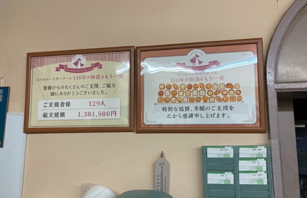 2026/01/05 19:52クラウドファンディングでご支援いただきました皆様、ありがとうございます。ベーカリーマザーグースの萩原ひとみです。謹んで新年のお慶びを申し上げます。10万円のご支援をくださった支援者様のお名前を店内掲示させていただきました。誠にありがとうございます。お名前の部分は、掲載の許可の確認がとれておりませんので念の為パンのアイコンで伏せております。年始以降にお届け予定のリターンにつきましても準備を進めておりますのでどうぞ宜しくお願い致します。 もっと見るご支援のお礼