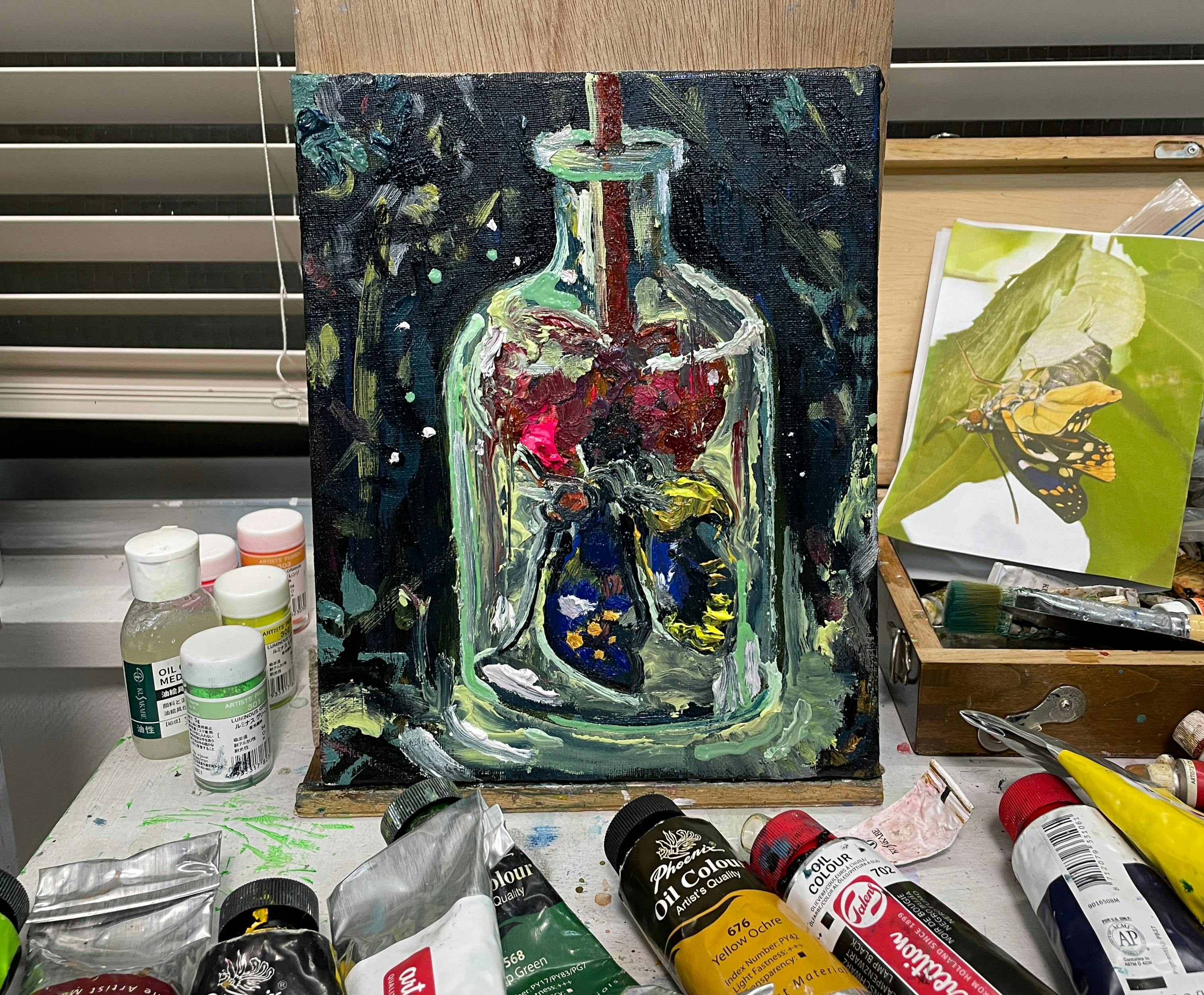 画像は、カードの裏面となるデザインを油彩で描いております。何を描いたか分かりますかね・・・?
