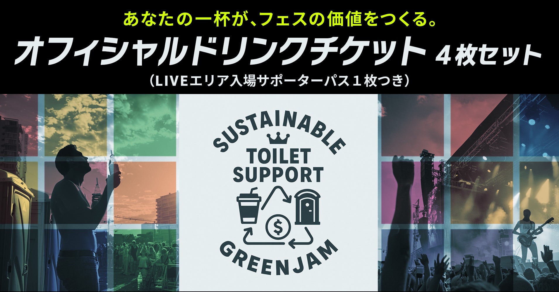 内容:ドリンクチケット(1枚)、LIVEエリア入場サポーターパス(お一人様分)、仮設トイレに支援者様の広告ポスターを掲示