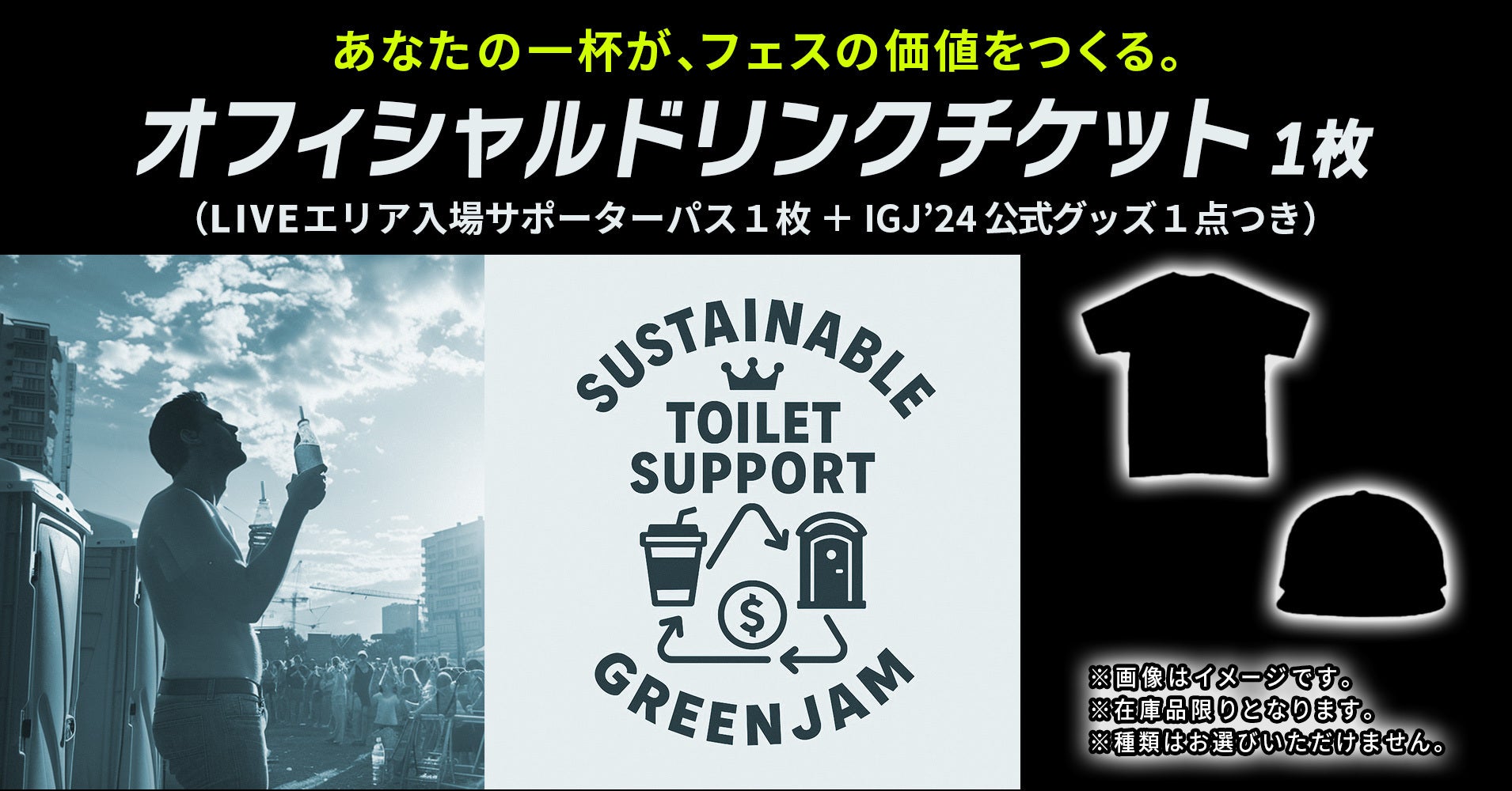 内容:ドリンクチケット1枚、LIVEエリア入場サポーターパス(お一人様分)、現在入手困難なITAMI GREENJAM'24公式グッズ(下記のいずれか)