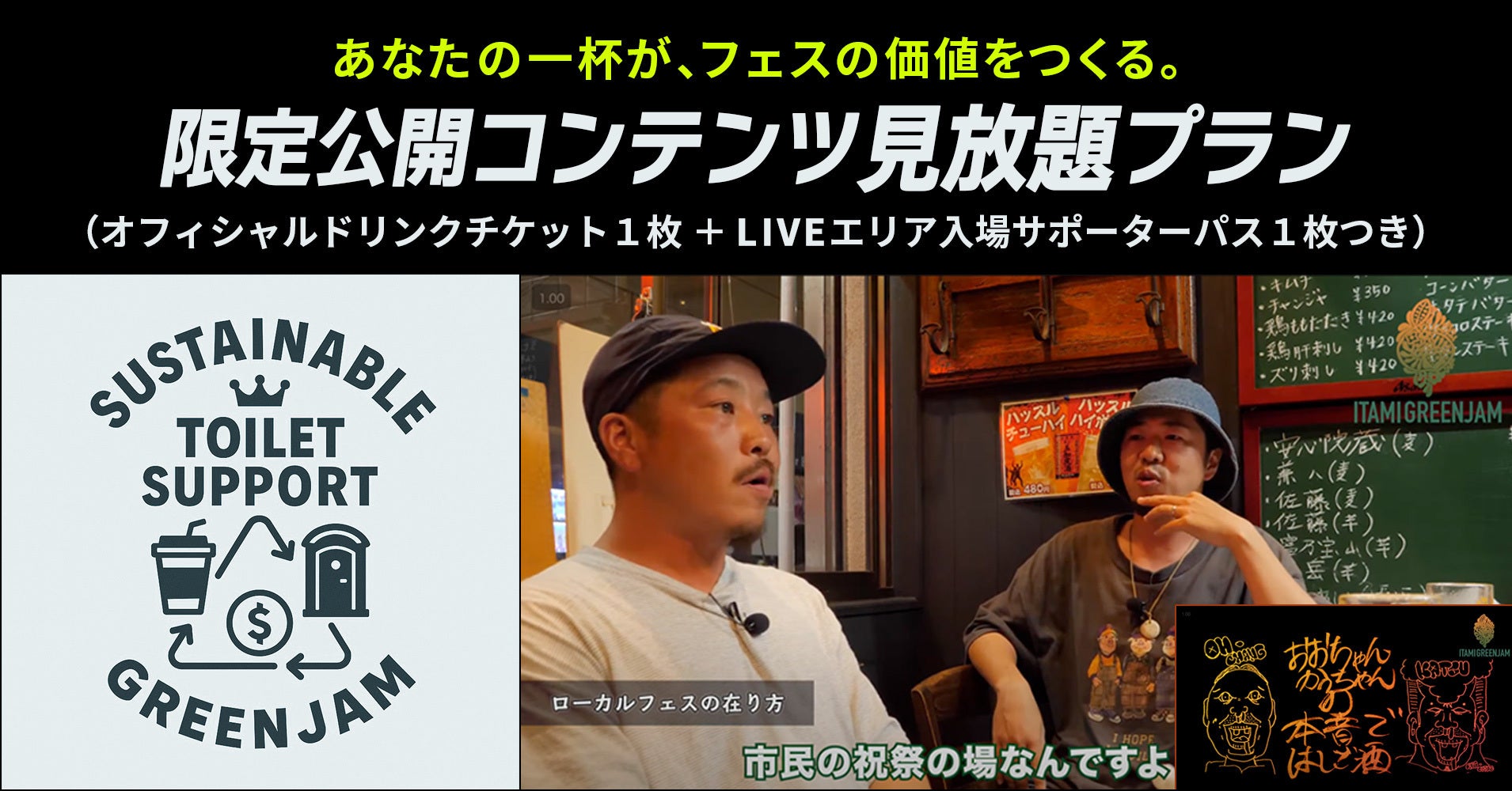 コロナ渦で開催中止となった2020年10月〜2021年1月にかけてオンラインサロン限定で全8回にわたり配信された伝説のトーク番組『おーちゃんかっちゃんの本音ではしご酒』。開催を目指して足掻き続けた「ITAMI GREENJAMとは何か?」その本質に迫るトータル240分超の動画コンテンツが見放題になるプランです。(※通信費はご負担ください。)