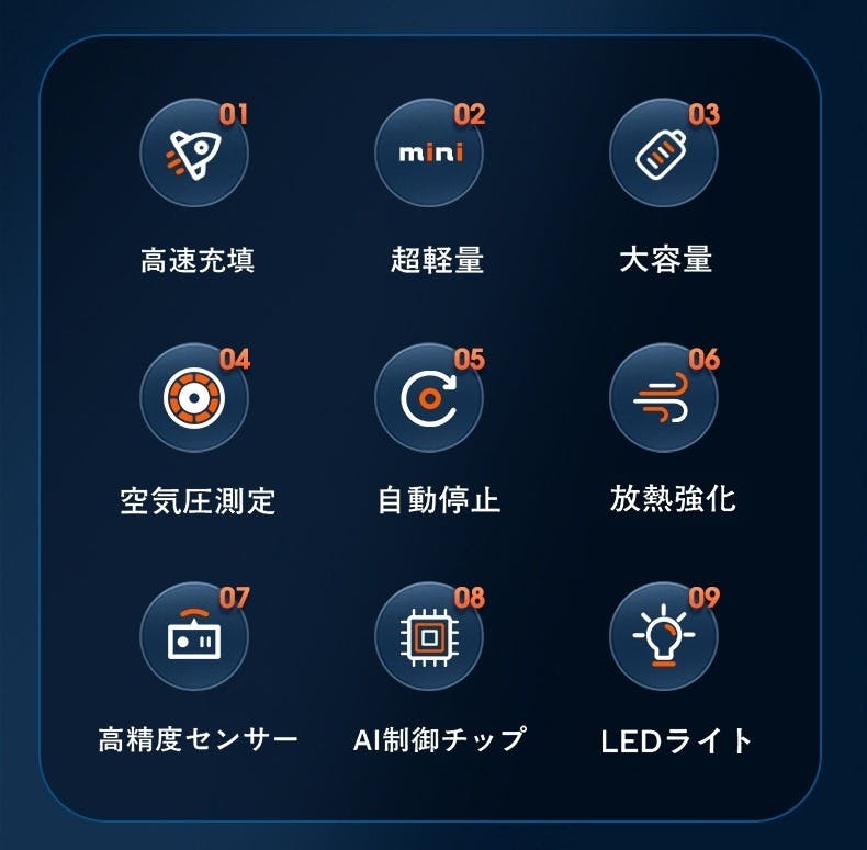 自転車・バイク・普通車のタイヤ、さらにはボール類にも対応する、携帯性と実用性を兼ね備えたミニ電動エアポンプです。ディスプレイや自動停止機能、LEDライトなど、便利な機能も満載で、サイクリングやアウトドアシーンでの「空気入れの手間」をスマートに解決します。