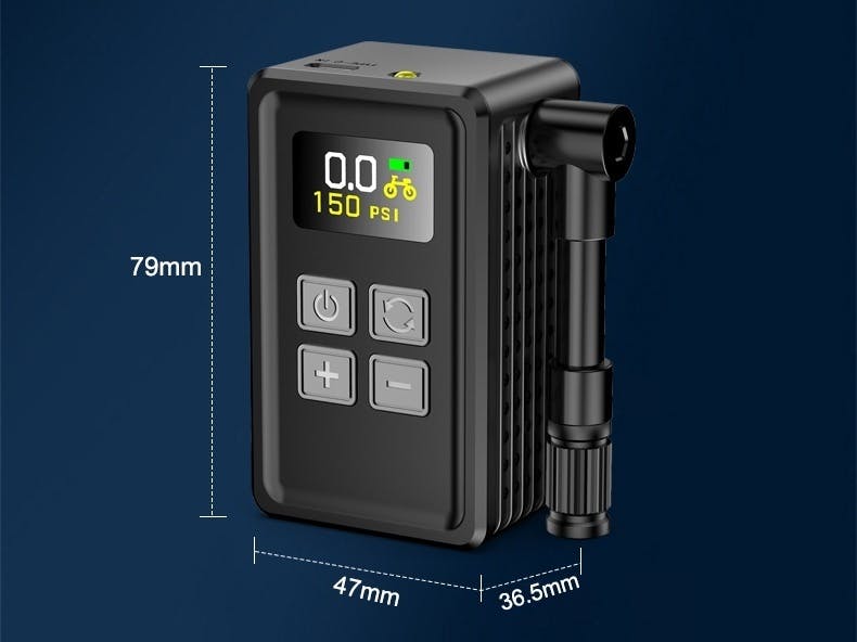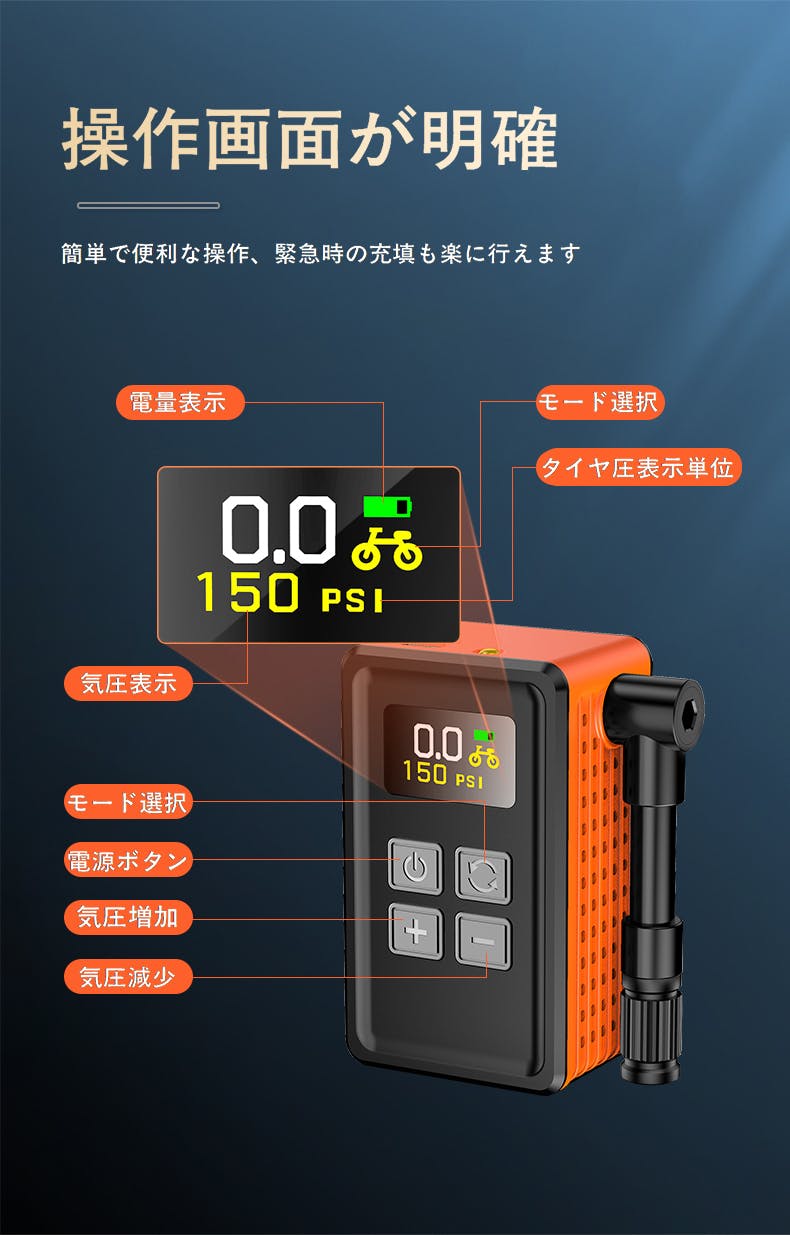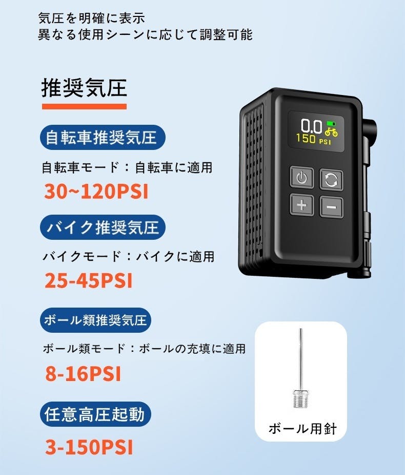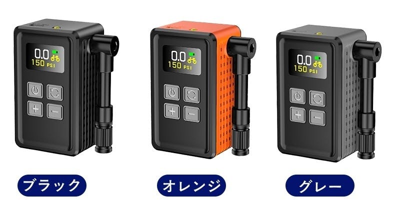 コンパクトな手のひらサイズで軽量設計のため持ち運びやすく、ポケットやバッグにもスマートに収納可能。液晶画面で空気圧を簡単に確認・設定でき、ボタンを押すだけで自動注入と自動停止が行えます。最大150PSIまで対応し、ロードバイクから自動車まで幅広く対応できるため、これ一台で空気入れの手間を解消します。