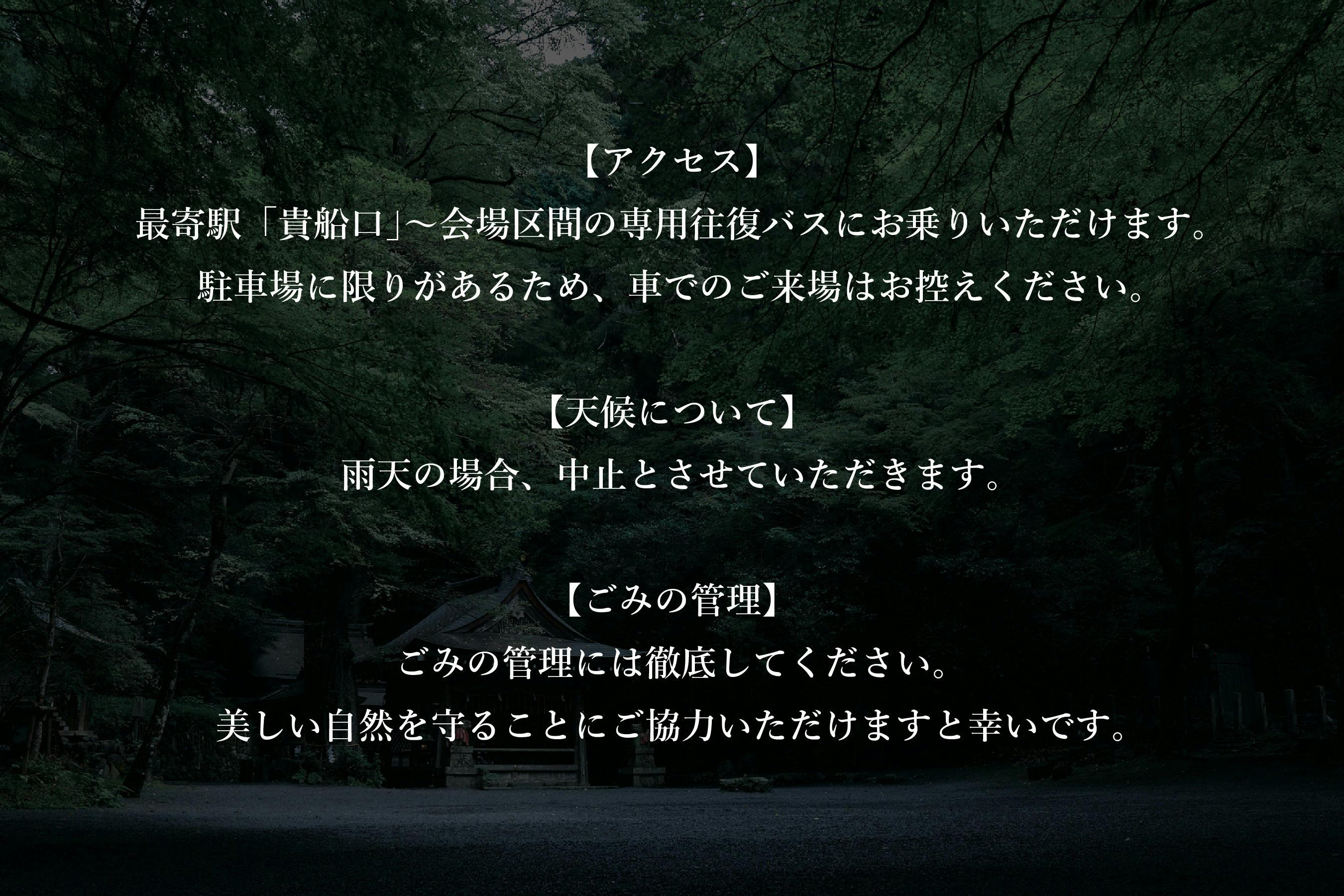 【アクセス】最寄駅「貴船口」〜会場区間の専用往復バスにお乗りいただけます。駐車場に限りがあるため、車でのご来場はお控えください。