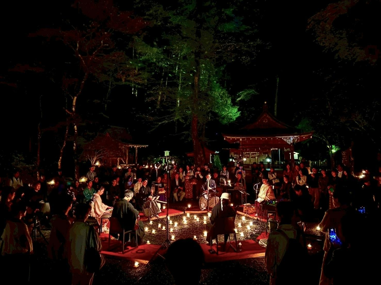 夜の貴船神社「奥宮」という特別な環境に、和楽器・ギター・ヒューマンビートボックス・自然音が交わる没入的なサウンドスケープ。