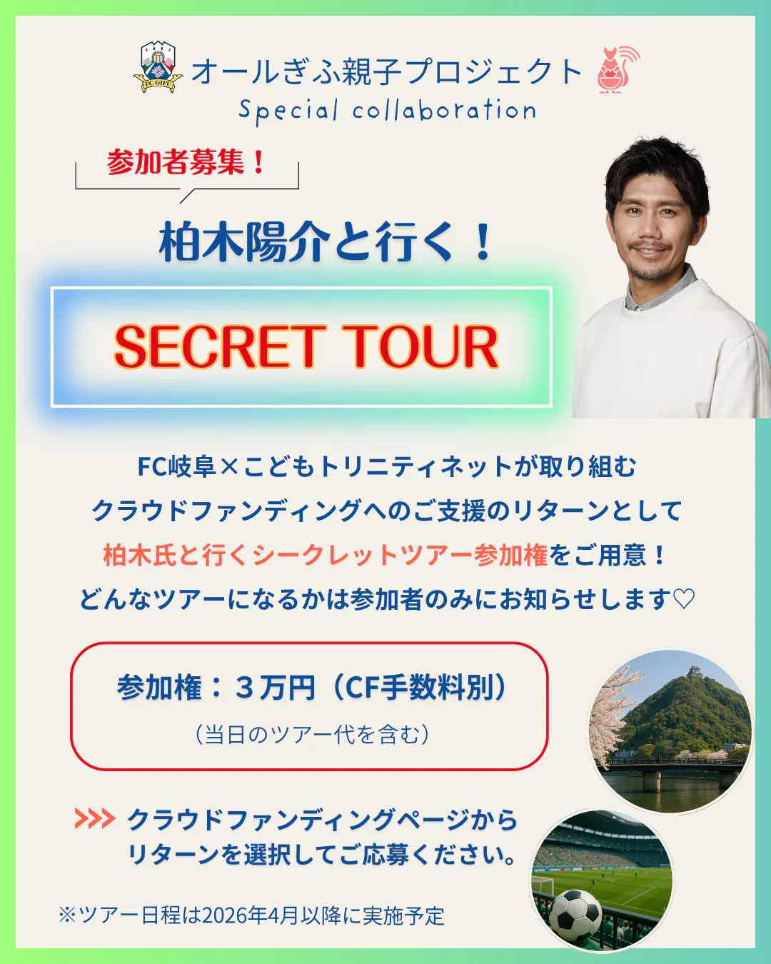 2025/10/18 15:04連日のご支援誠にありがとうございます。ご支援のリターンとして掲載している柏木陽介さんとのコラボ企画についてお知らせいたします。柏木さんと行く「シークレットツアー」です!!!!!例えば・・・・岐阜の魅力たっぷり、柏木さんセレクトの岐阜旅?!→岐阜の魅力が詰まったツアー!ぜひ遠方の方にも来ていただきたいです♪・アウェーでの試合観戦?!→柏木さん解説付きの試合観戦最高ですね・・!上記は現段階で候補に挙がっているものになりますが、どんなツアーになるかはお楽しみに・・・!!ご支援いただいた方のみにプロジェクト終了後、内容をお知らせいたします♪参加権をぜひゲットしてくださいね。※実施は2026年4月以降となります。【ツアーの旅行企画・実施者】株式会社日本タクシー(岐阜県岐阜市鶴田町3-7-1)岐阜県知事登録旅行業第2種39号国内旅行業務取扱管理者:山田 康二郎・旅行契約の成立: 参加者(支援者)と上記旅行業者との間で旅行契約が成立します。・費用の清算: ご支援金のうち、ツアーの旅行代金相当額はこどもトリニティネットから旅行業者へ全額支払われます。・今後の連絡: ツアーに関する詳細(日程、集合場所、契約書面など)は、後日、上記旅行業者より(メール・FAX/電話)直接ご連絡いたします。 もっと見る