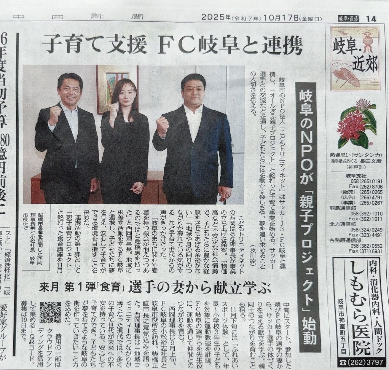 オールぎふ親子プロジェクトについて、本日の中日新聞に掲載されました。この日は、FC岐阜の小松代表と共にプロジェクト内容について岐阜市長の柴橋市長へ報告させて頂きました。残りわずかですが、引き続き頑張ってまいります!宜しくお願いいたします!