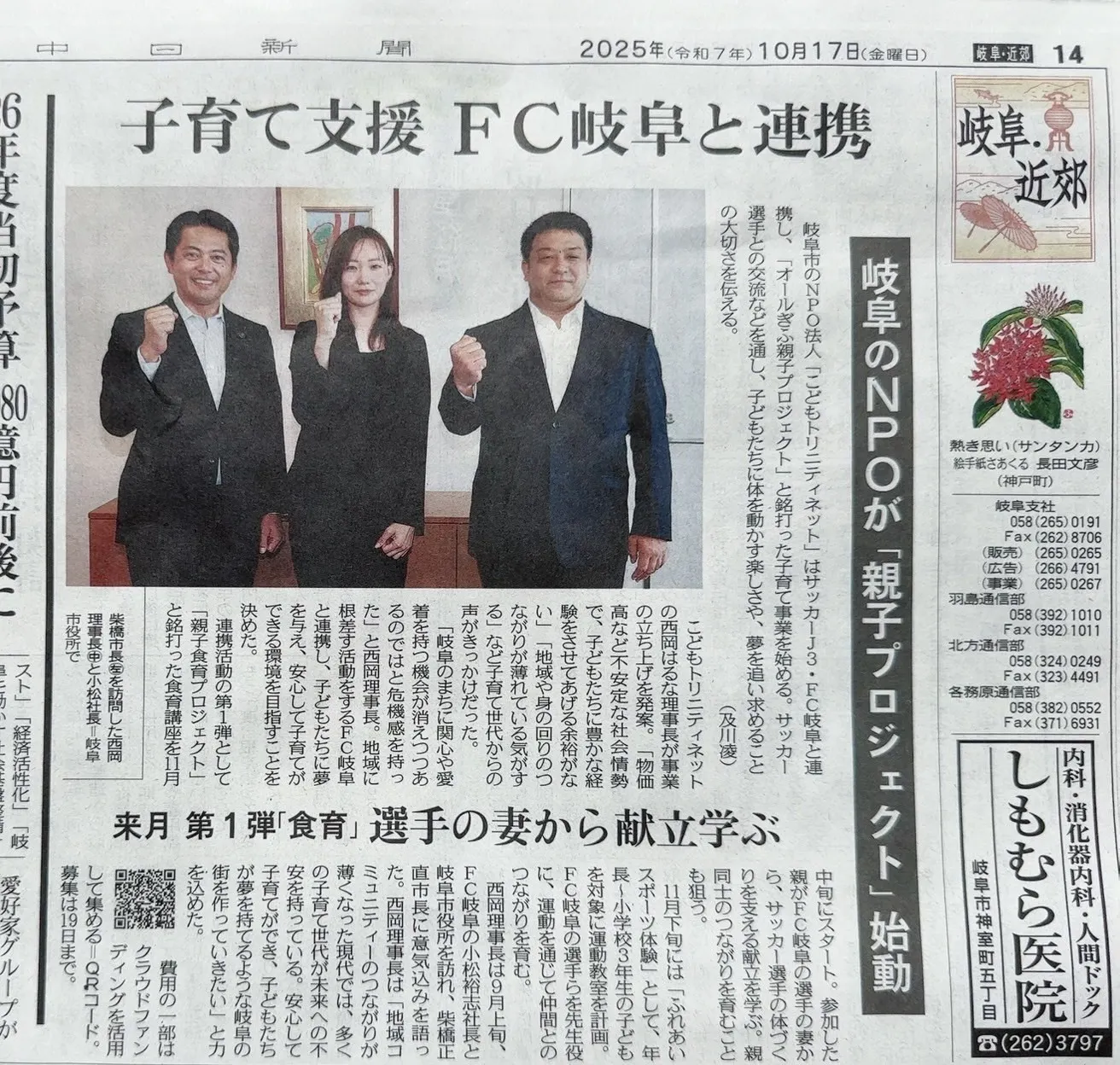 オールぎふ親子プロジェクトについて、本日の中日新聞に掲載されました。