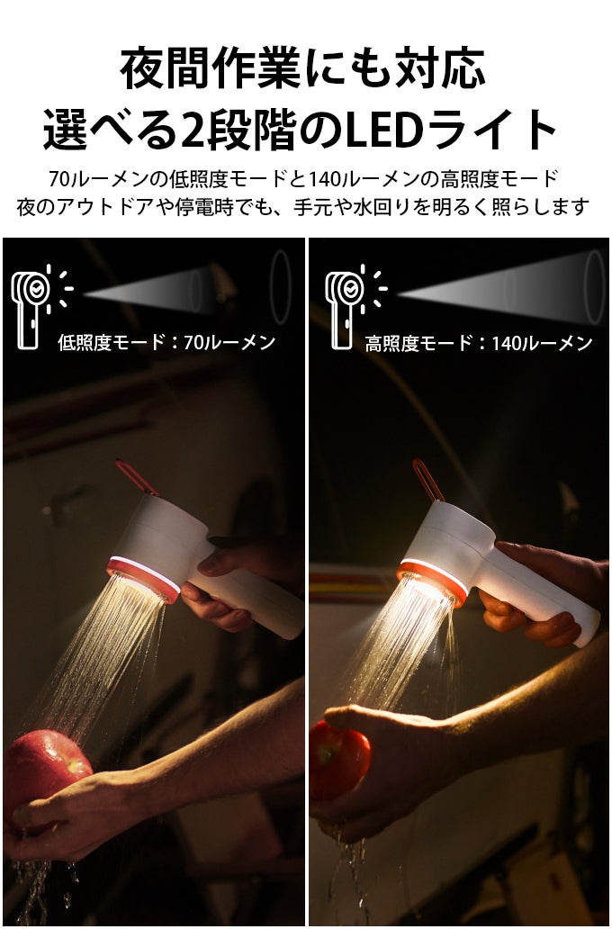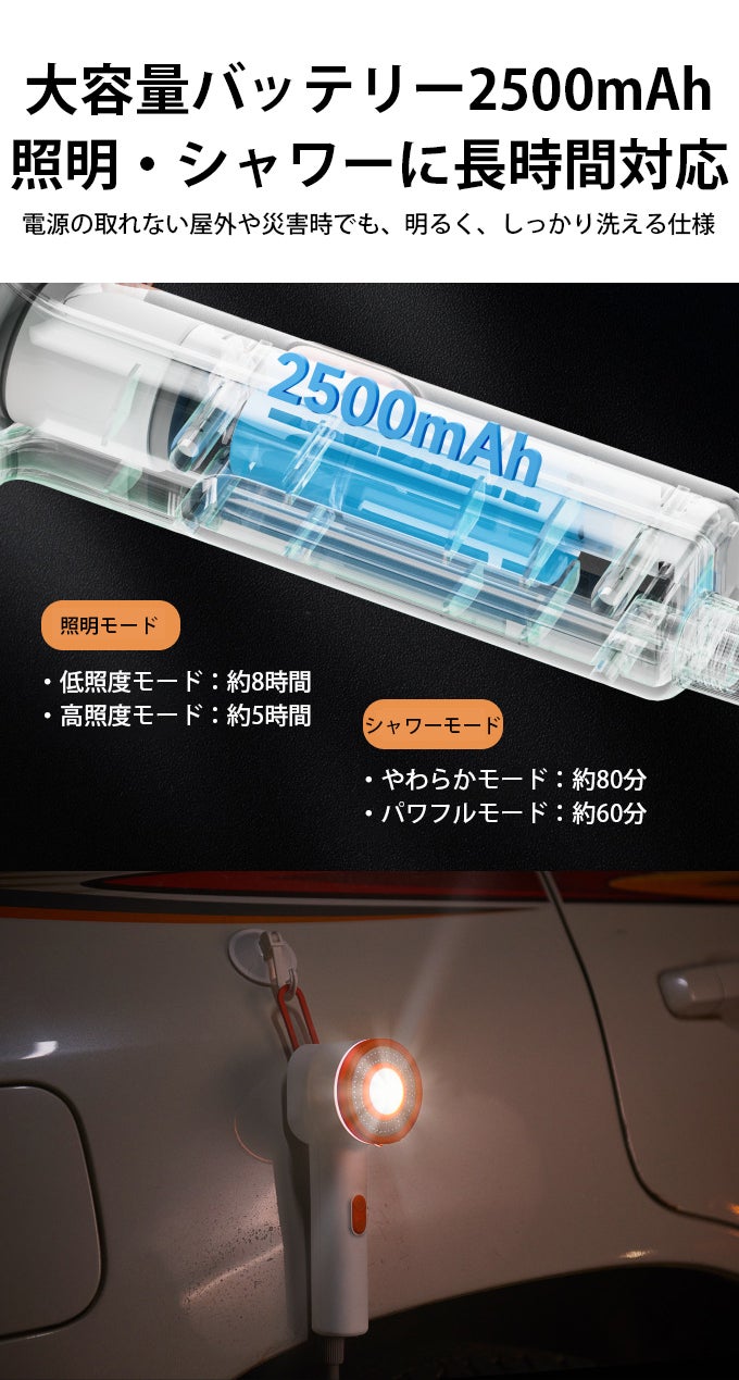 2500mAhの大容量バッテリーを搭載しているため、シャワーは最大約60分、LEDライトは最大約8時間連続使用でき、キャンプや停電時など電源がない環境でも安心して使えます。