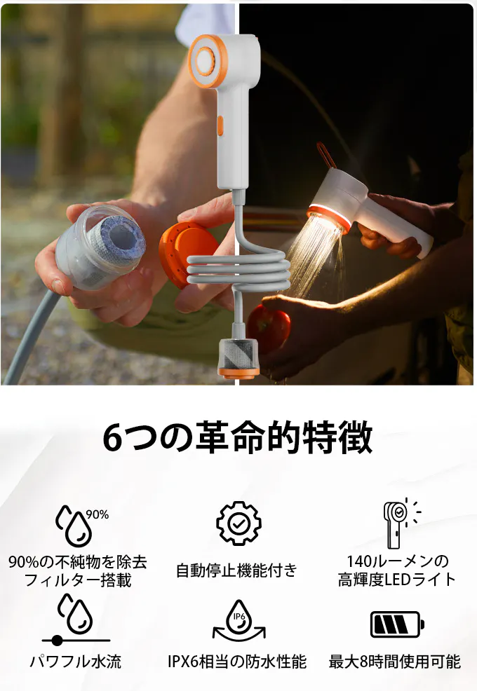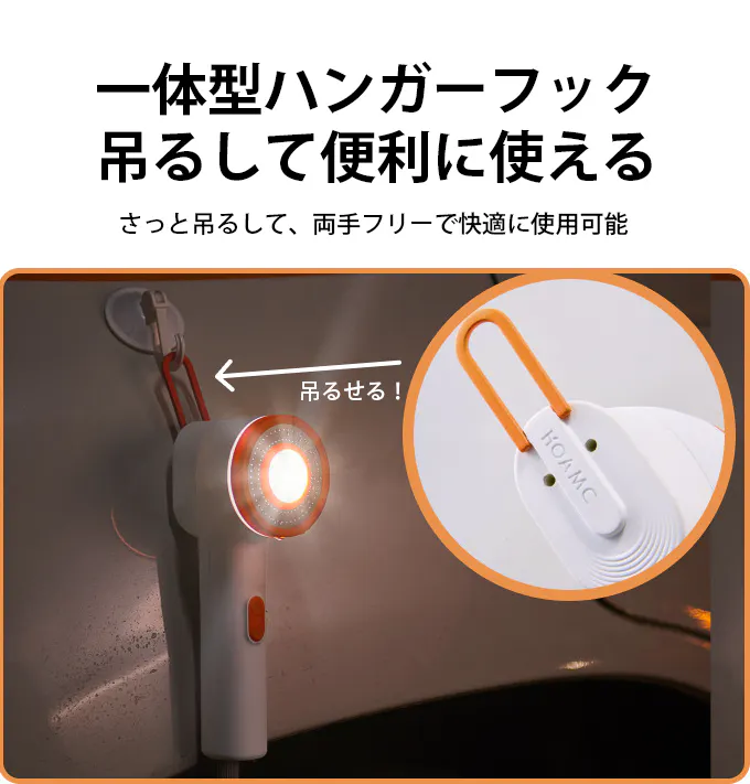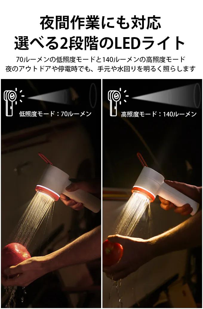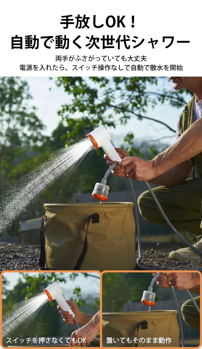 吊るして使用可能なフック付きデザインのため、高い位置からのシャワーや照明としても使え、キャンプや車中泊など限られたスペースでも快適に利用できます。