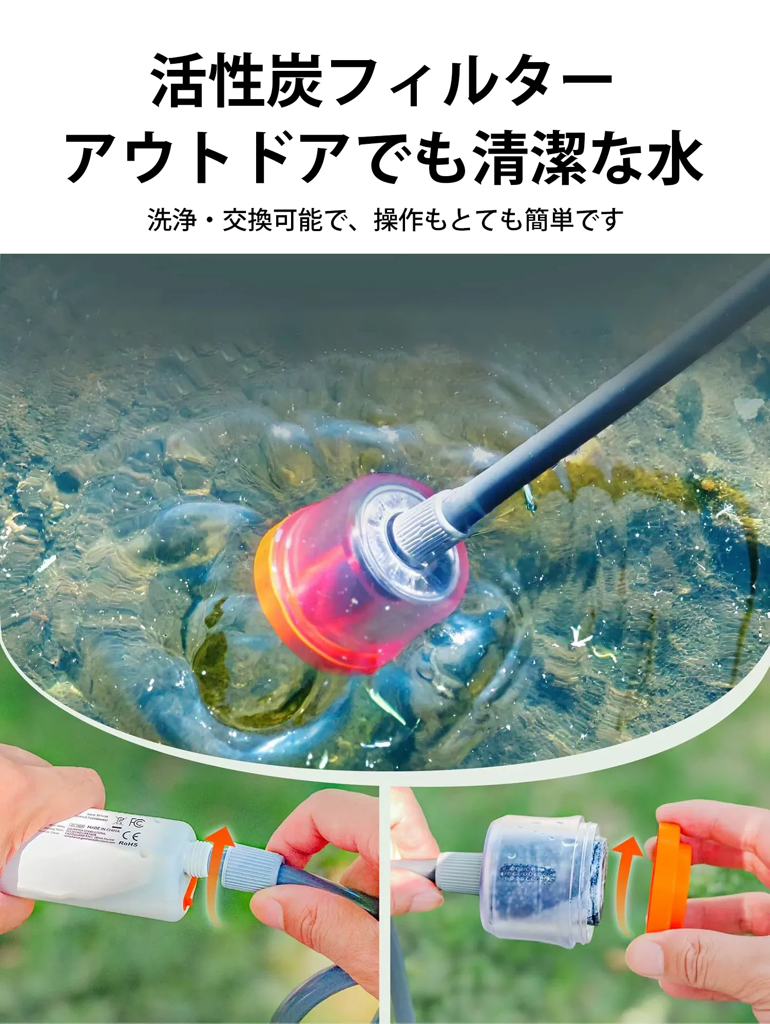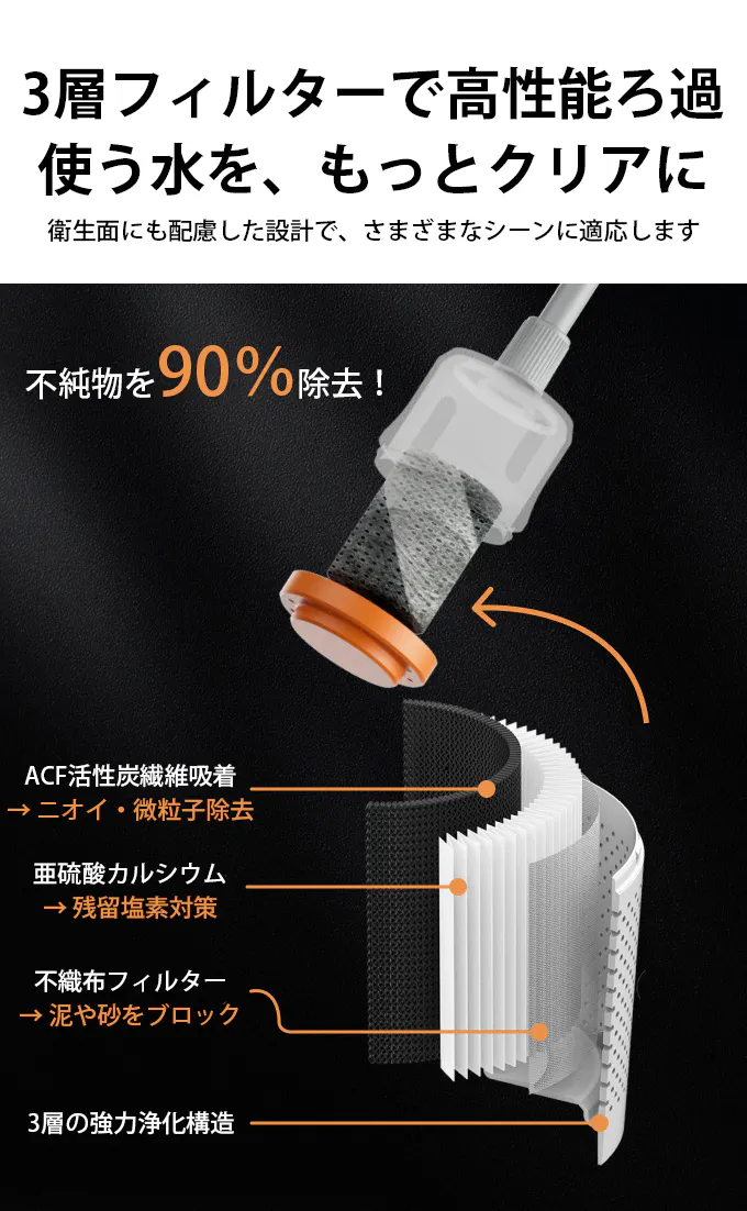 3層構造フィルターで90%の不純物を除去できるため、川やタンクの水でも安心してシャワーや食器洗いなどに使えるきれいな水を確保できます。