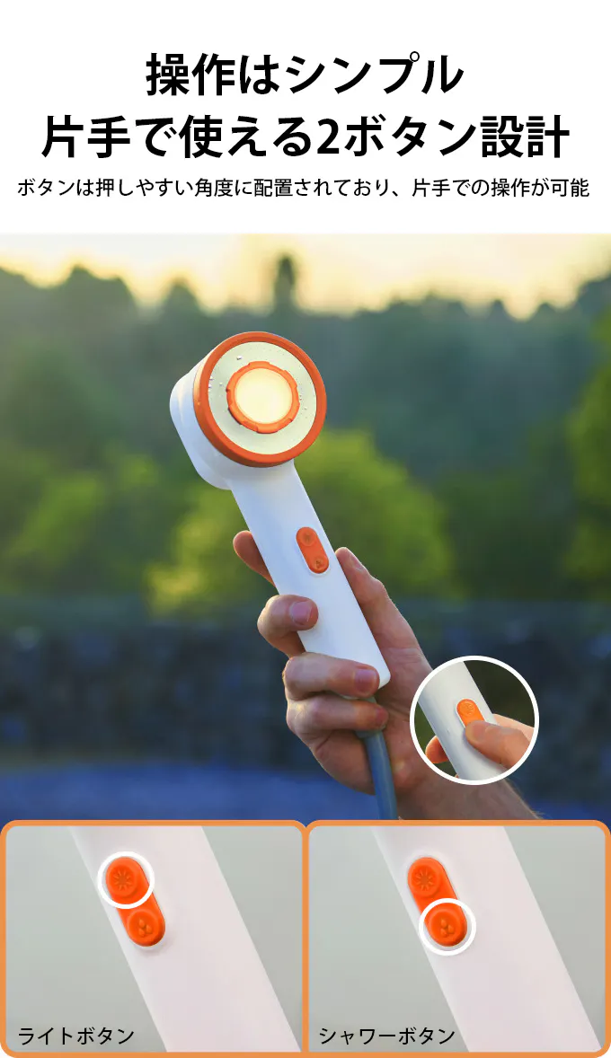 片手で操作できる2ボタン設計により、水流モードとLEDライトを直感的に切り替えられ、シャワー中でもスムーズに操作できます。